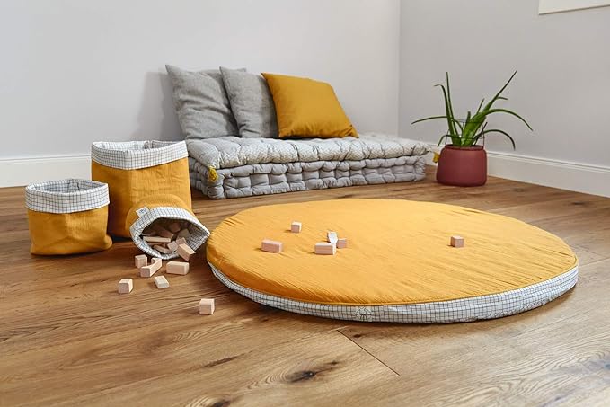 Prosta, okrągła poduszka do siedzenia firmy LÄSSIG z bio-bawełny zapewnia dzieciom wystarczająco dużo miejsca do zabawy, szaleństwa i odpoczynku.