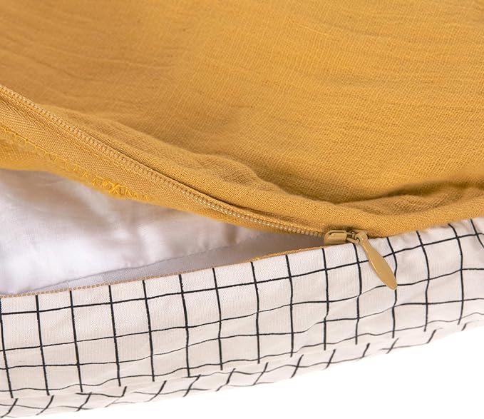 Jednokolorowa, nowoczesna struktura tkaniny Mull w połączeniu z wytrzymałym materiałem perkalowym w kratkę jest nowoczesna i kolorowa i doskonale pasuje do każdego pokoju dziecięcego.