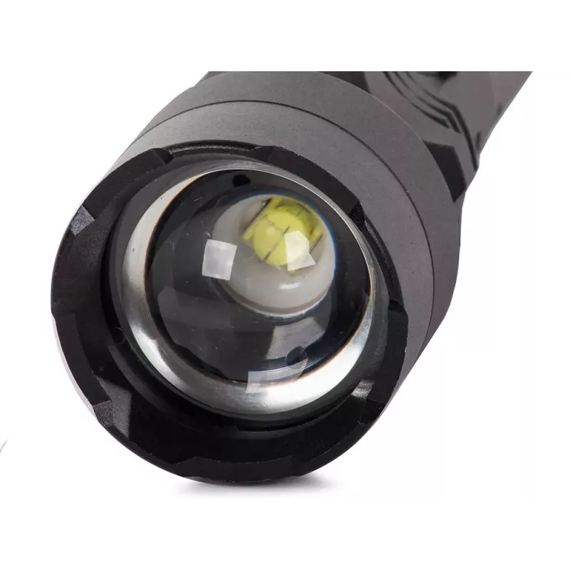 Funkcja zoom - płynna regulacja zmiany ogniskowej padania światła, dzięki wykorzystaniu soczewki skupiającej. Daje to możliwość regulacji od wąskiego mocnego promienia światła o dalekim zasięgu - 1000m do szerokiego pola, który oświetla duży obszar roboczy. Te cechy sprawiają, że latarka niesamowicie sprawdza się w każdym terenie.