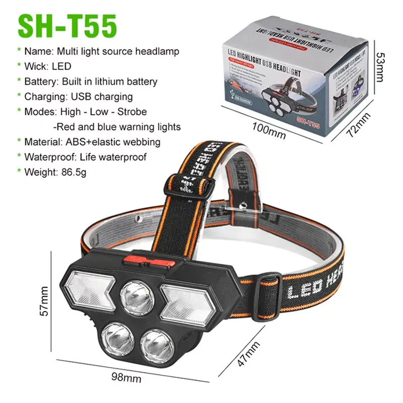 Latarka na głowę SH-T55 z wbudowaną baterią litowo-jonową. Posiada 4 tryby pracy i regulowany kąt nachylenia. Czołówka wykonana jest z tworzywa ABS. Dodatkowo latarka czołówka wyposażona jest w pulsujące na przemian światło czerwono-niebieskie.