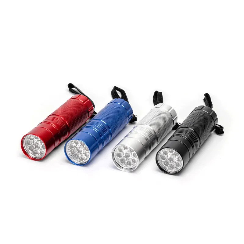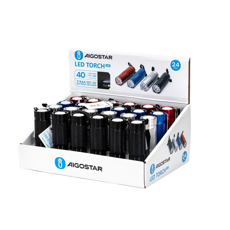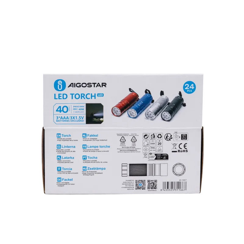 Uniwersalna latarka kieszonkowa do użytku na zewnątrz i wewnątrz z 3 trybami: mocne światło, światło miękkie i światło migające. Zasilanie z trzech baterii AAA, nie stosować akumulatorków.