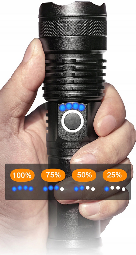 - 5 trybów świecenia: 100%, 60%, 30%, stroboskop oraz sygnał SOS, które zwiększają funkcjonalność latarki w różnych sytuacjach