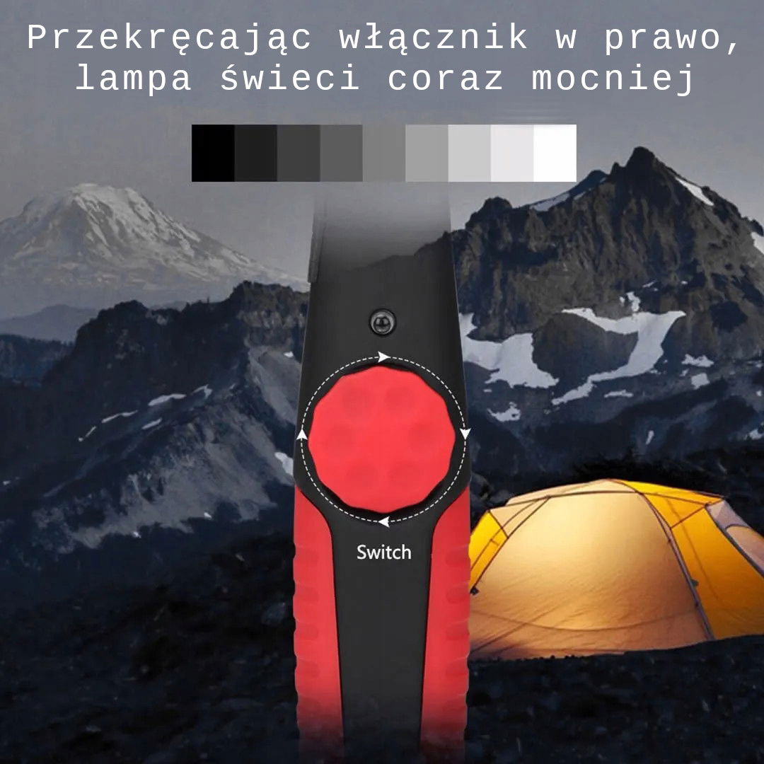 Wielofunkcyjna latarka może służyć jako lampa warsztatowa, latarka lub lampa kempingowa.