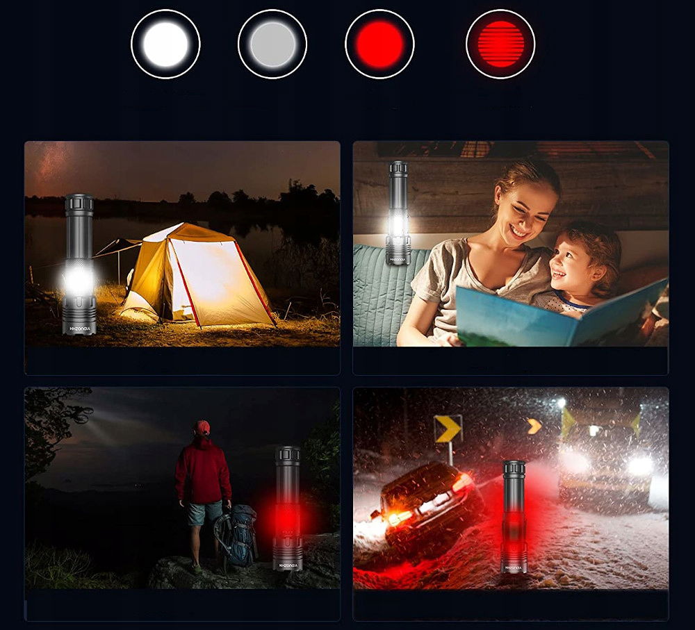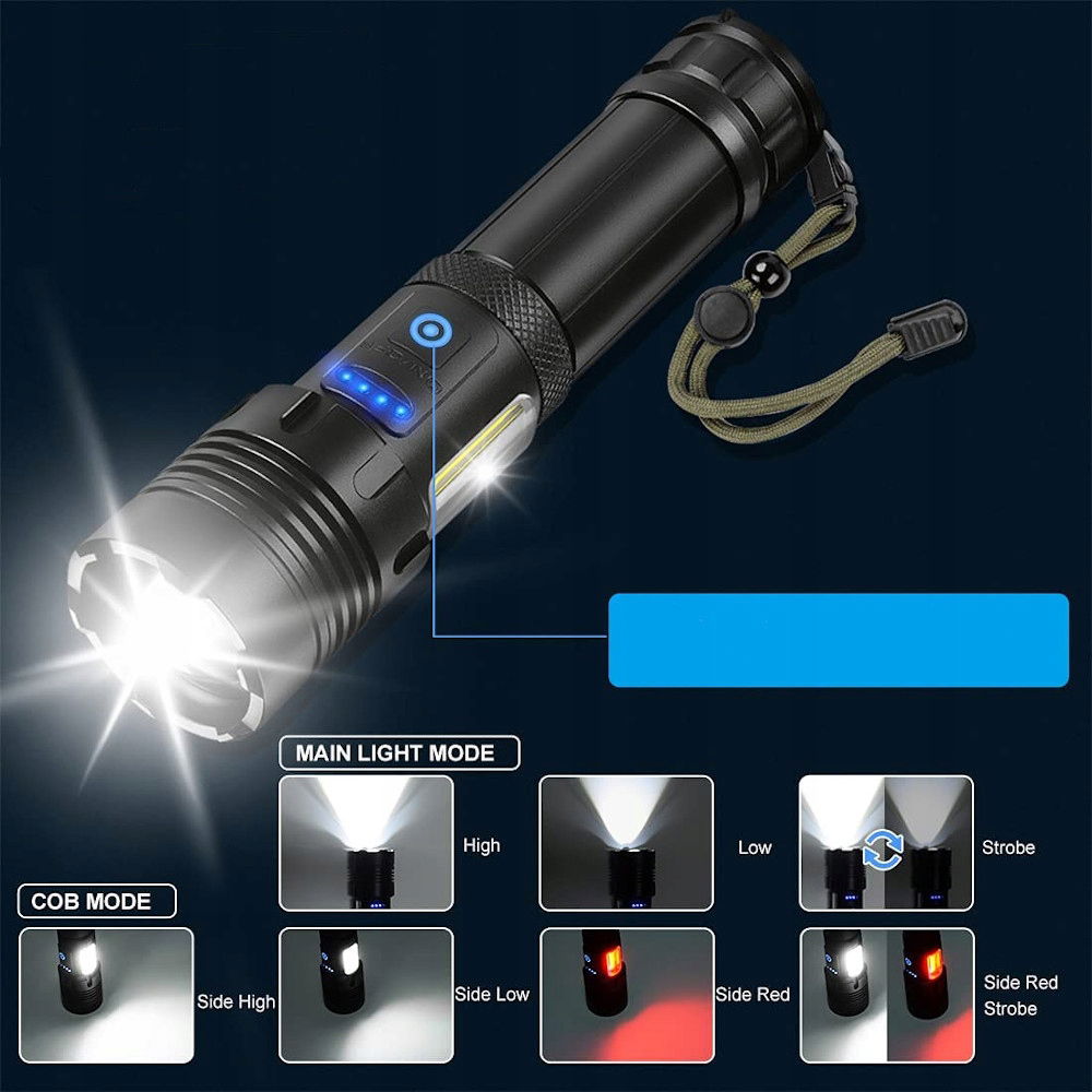 - Tryby świecenia COB: 100% - 50% - Czerwony - SOS