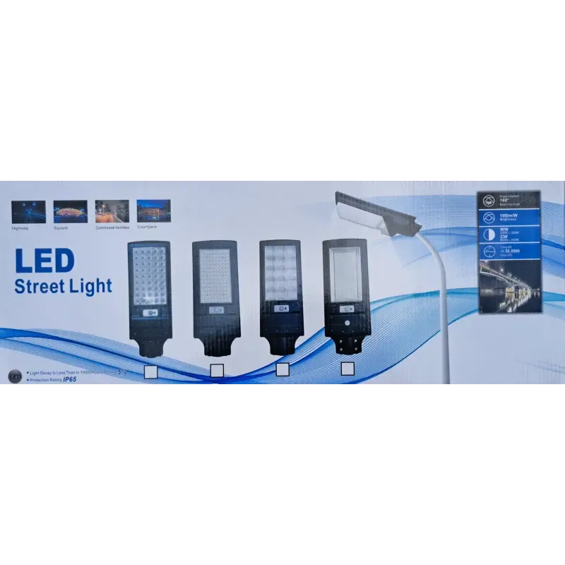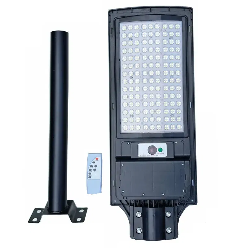 Latarnia uliczna solarna 504 mocnych LED SMD 150W IP65, posiada wbudowany czujnik ruchu i zmierzchu, W zestawie panel słoneczny, pilot sterujący i mocowanie do słupka lub ściany fi50. Lampa ma timer i regulacją jasności. Wszystkie rodzaje pracy są powtarzalne i działają po zmroku.