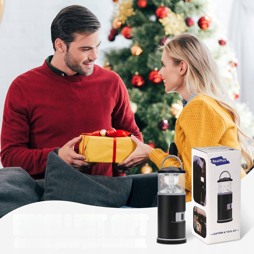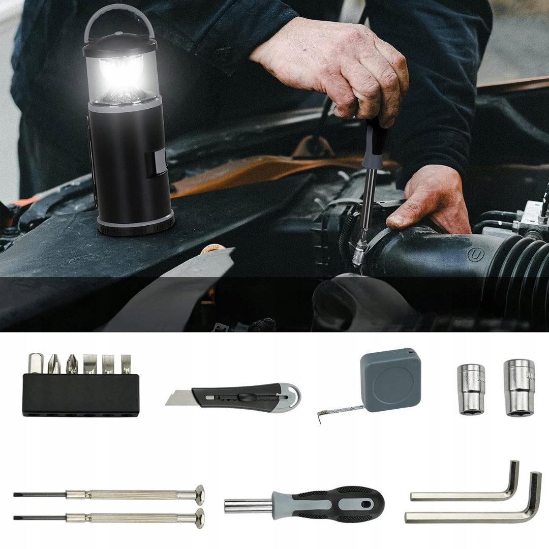 - Unikalny prezent dla mężczyzny: zestaw 2 w 1 łączy latarnię kempingową z kompletem narzędzi, w tym wbudowaną rękojeść, nasadki, wiertło, linijkę, nóż uniwersalny i inne akcesoria. Urządzenie jest łatwe w obsłudze i funkcjonalne, sprawdzając się podczas wędkowania, kempingu oraz w codziennym użytkowaniu.