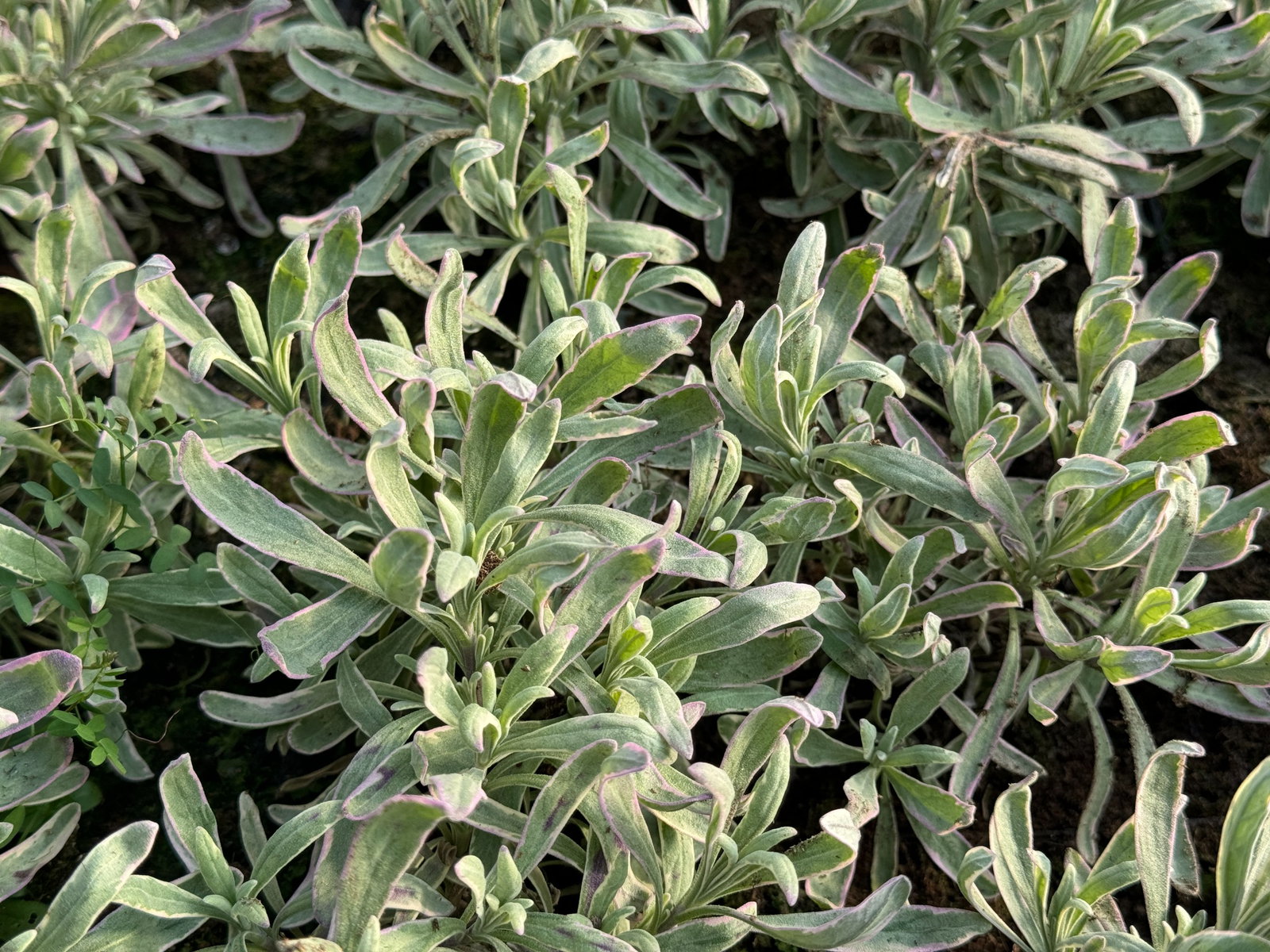 - Liście: Wąskie, lancetowate liście mają ozdobne, jasne marginesy, przez co nabierają srebrzystego wyglądu. Ta cecha wyróżnia roślinę na tle innych odmian lawendy. Liście wydzielają intensywny zapach po roztarciu, typowy dla lawendy wąskolistnej.