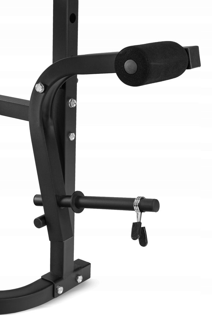 - Bezpieczeństwo: Blokada zabezpieczająca sztangi, gumowane odbijaki i nakładki antypoślizgowe.