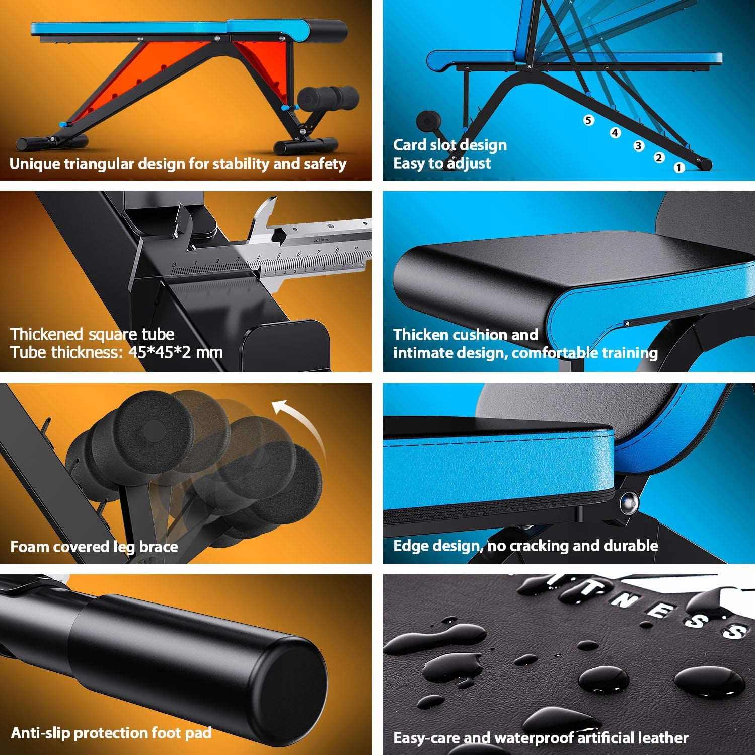 Ta ławka treningowa do wielu ćwiczeń może zapewnić różnorodne ćwiczenia, idealne do ćwiczeń bicepsów, wyciskania na ławce, wyciskania ramion, treningu mięśni brzucha, ćwiczeń na nogi i innych. To świetne urządzenie do treningu całego ciała w domu lub na siłowni.