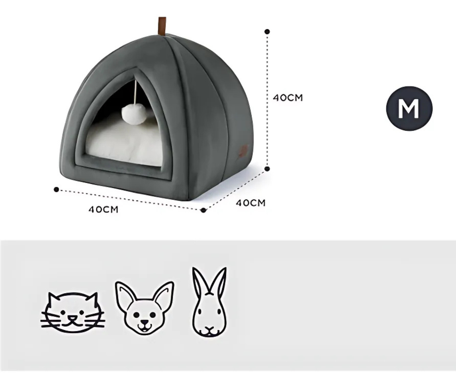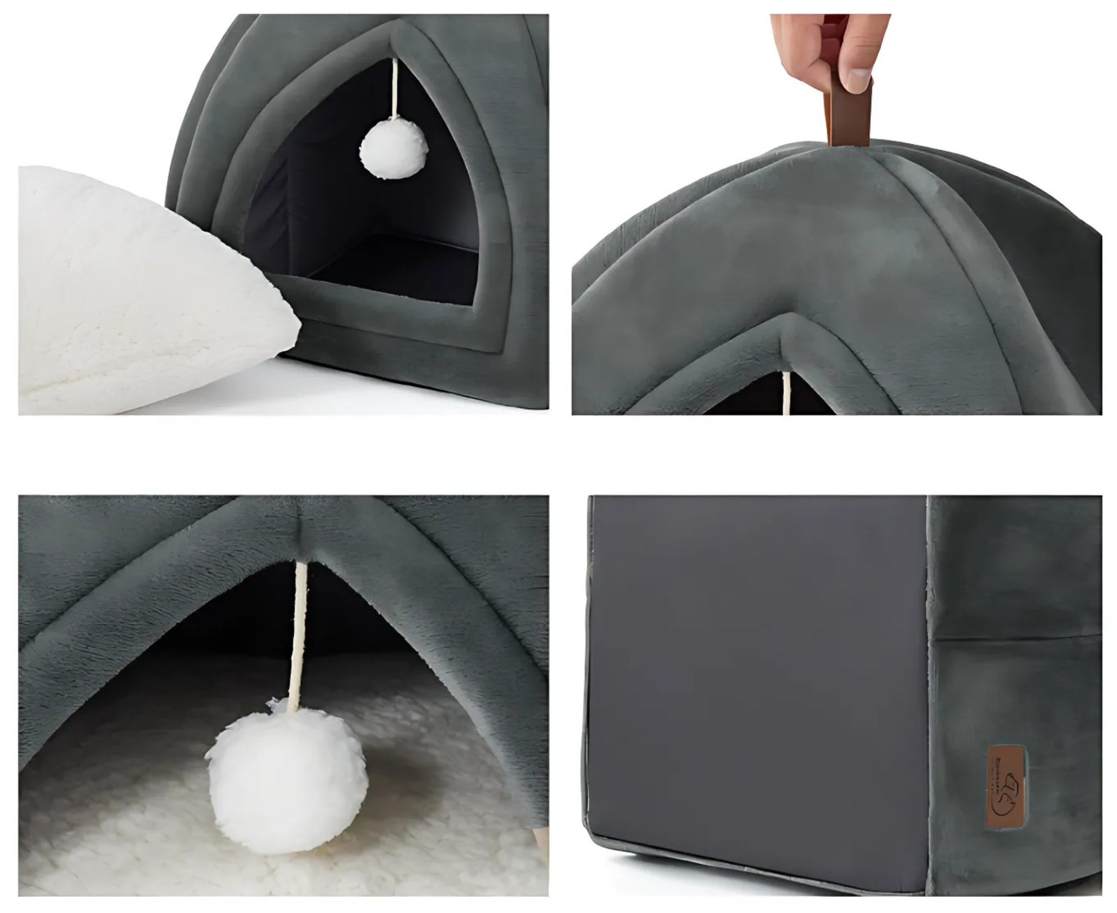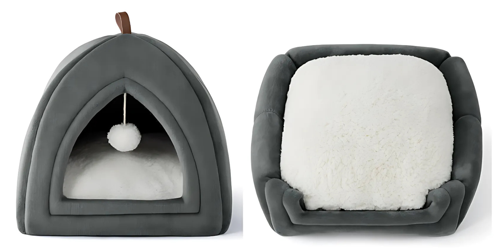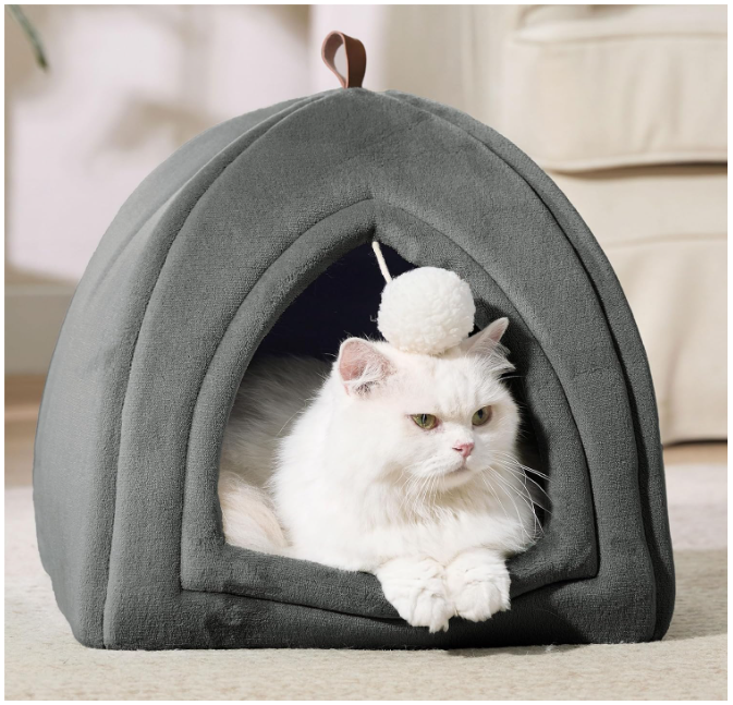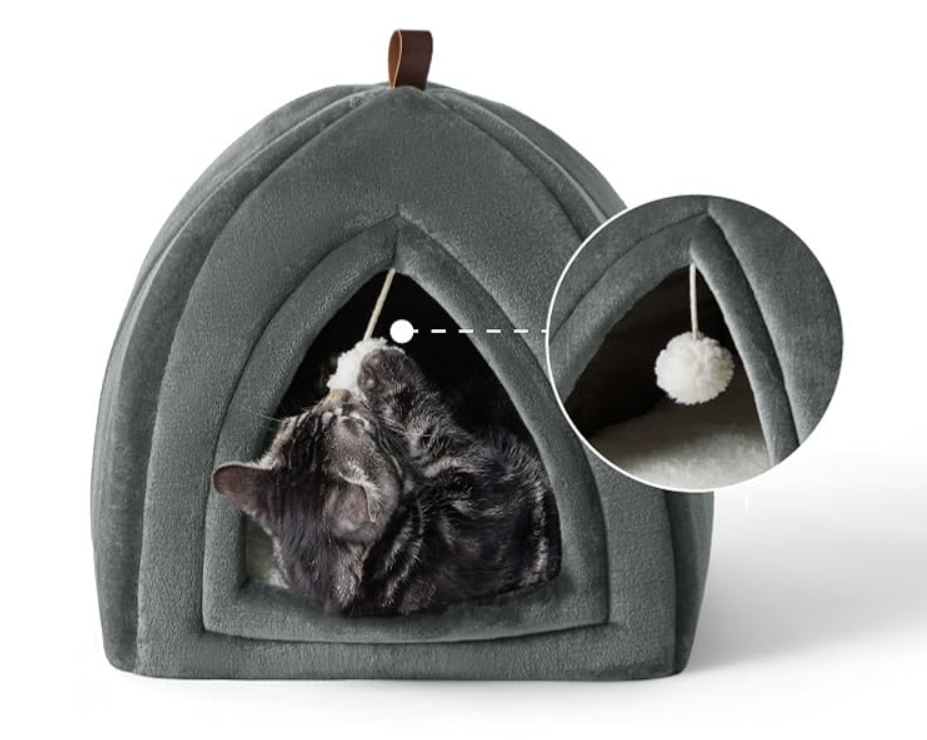 ➡️ Dodatkowo, ta przytulna jaskinia dla kota posiada uroczą, wiszącą kulkę-zabawkę!