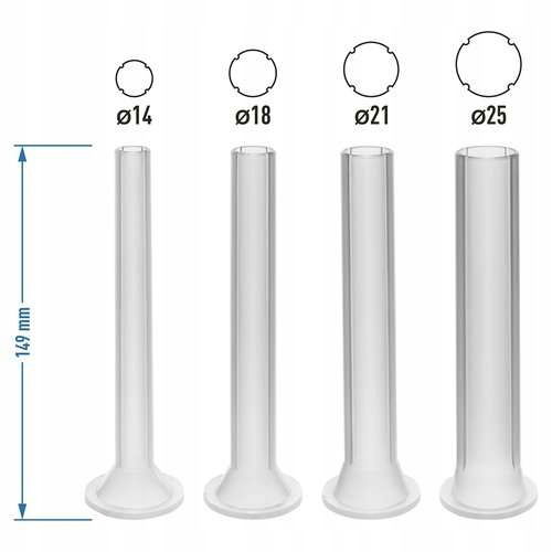 Praktyczny zestaw (4 sztuki) zapasowych lejków dedykowanych do określonych modeli nadziewarek marki Browin - o pojemności od 1,5 kg do 4 kg. Każdy lejek ma inną średnicę w części wylotowej: 14 mm, 18 mm, 21 mm i 25 mm. Z kolei średnice tulei w części wlotowej wynoszą kolejno: 17 mm, 20 mm, 23 mm i 28 mm. Średnica kołnierza (przy łączeniu z korpusem nadziewarki) jest dla wszystkich lejków w zestawie taka sama i wynosi 42 mm.