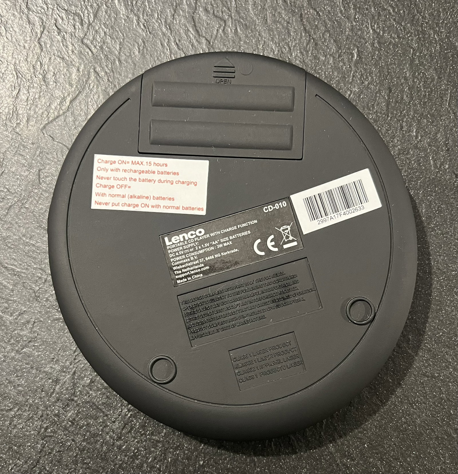 Zasilanie bateryjne: CD-010 może być zasilany bateriami konwencjonalnymi lub akumulatorami. Baterie (brak w zestawie) można również ładować za pomocą kabla ładującego.