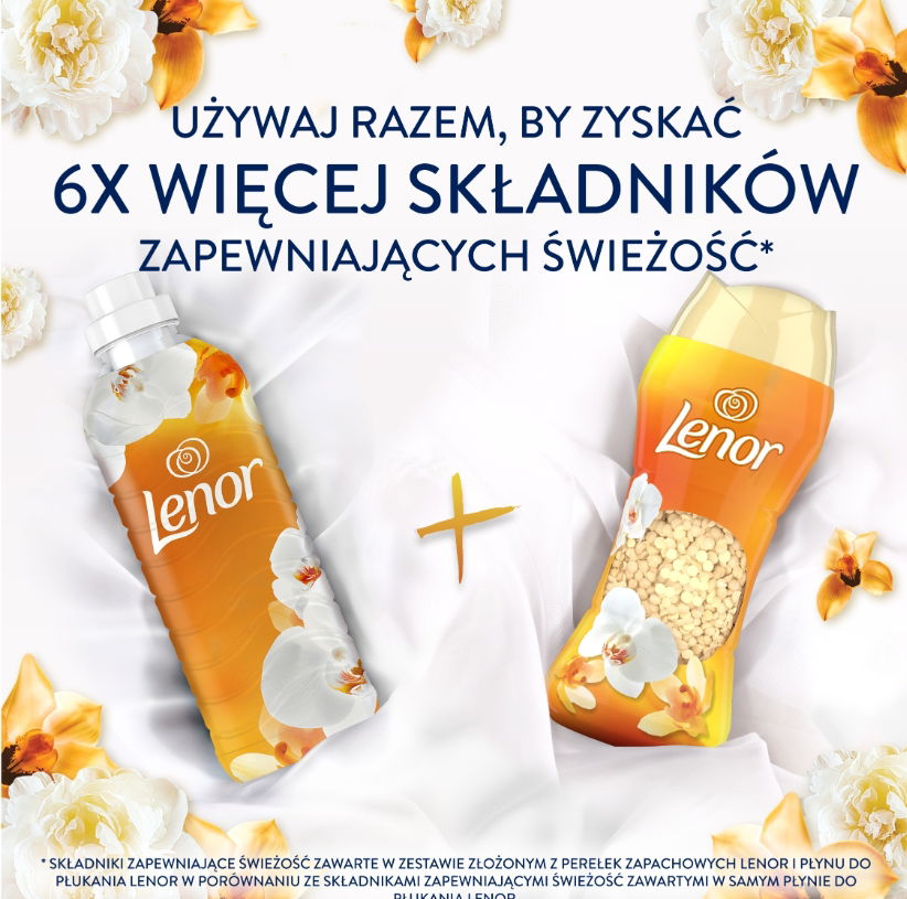 Odkryj perfumowane perełki zapachowe do prania Lenor, które otulają ubrania zapachem Gold Orchid Vanilla, zapewniając im nieustanną świeżość, do 12 tygodni w przypadku przechowywanych ubrań. Ten zapach elegancji jest nasycony nutami szlachetnej wanilii, która koi zarówno emocje, jak i ducha. Lenor Gold Orchid Vanilla, nasycony rozkosznymi akordami kwiatowymi i nutami wanilii, zapewnia niezwykle słodkie wrażenia zmysłowe. Perełki zapachowe do prania Lenor Gold Orchid Vanilla zostały stworzone po to, by działać w idealnej harmonii z płynem do zmiękczania tkanin Lenor Gold Orchid Vanilla.
