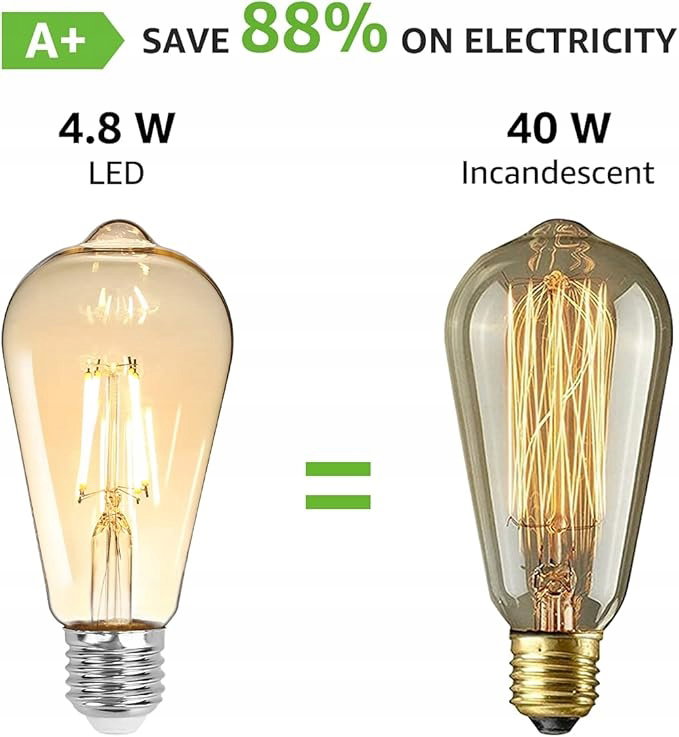 Oszczędność energii: zabytkowa żarówka Edison Ta lampa LED o mocy 4,8 W zastępuje żarówkę o mocy 40 W, oszczędzając ponad 88% kosztów energii elektrycznej.