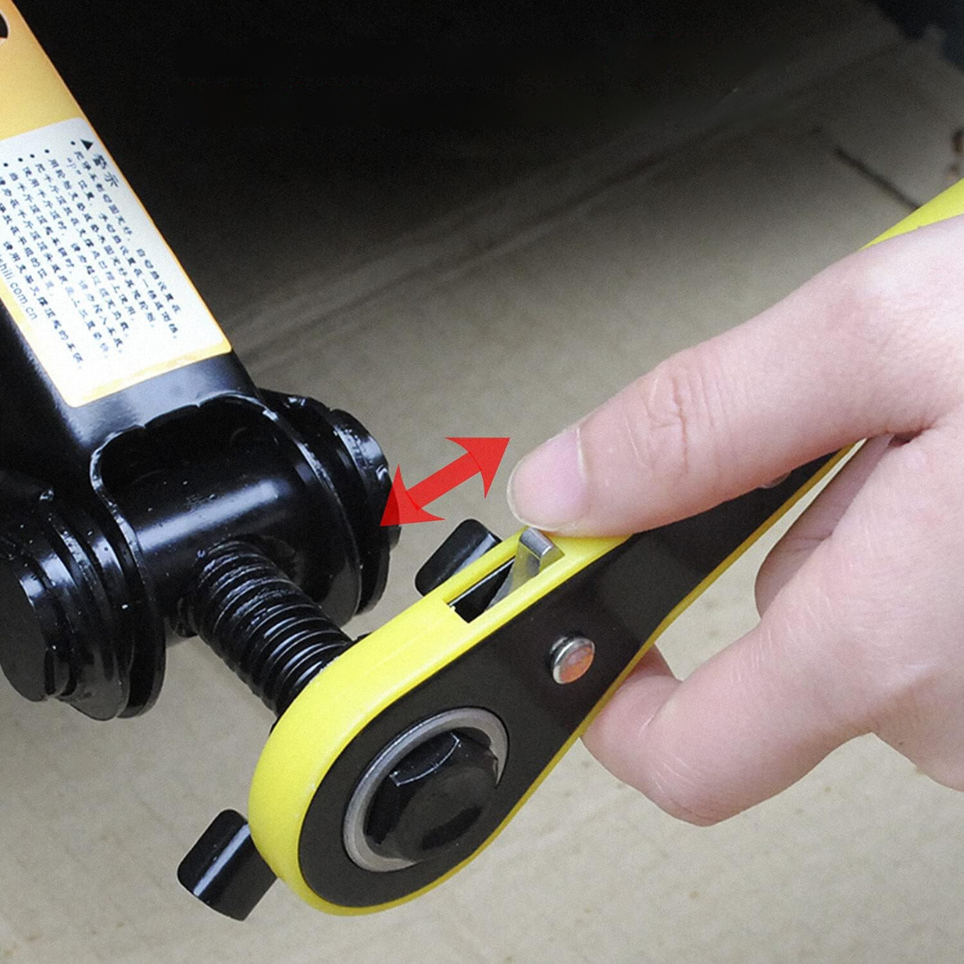 Zestaw zawiera klucz zapadkowy, co ułatwia proces wymiany koła, a jego kompaktowe wymiary sprawiają, że podnośnik jest łatwy do przechowywania i transportowania w samochodzie.