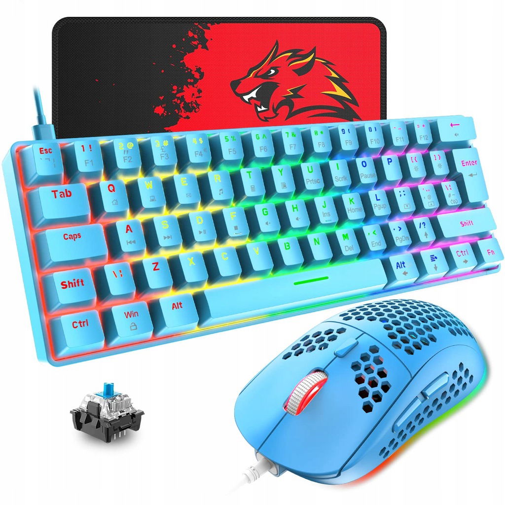 nazwa przedmiotu: T60 Przewodowa Klawiatura i Mysz do Gier, Mini 60% kompaktowa Klawiatura Mechaniczna z 62 Keys, 19 Tęczowe światło LED, UK Layout + Mysz do Gier PS4 6400 DPI + Podkładka pod mysz - Blue Switch/Blue