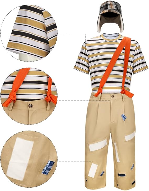 Wysokiej jakości materiał: ten meksykański kostium cosplay Chavo do roli dramatu wykonany jest głównie z poliestru, który jest przyjazny dla skóry i oddychający, miękki i łatwy do zakładania i zdejmowania.