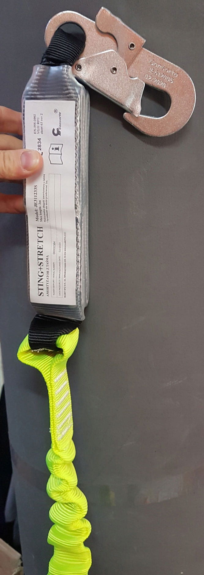 Linka asekuracyjna szelki STING taśma STRECH amortyzatorem hak do rusztowań