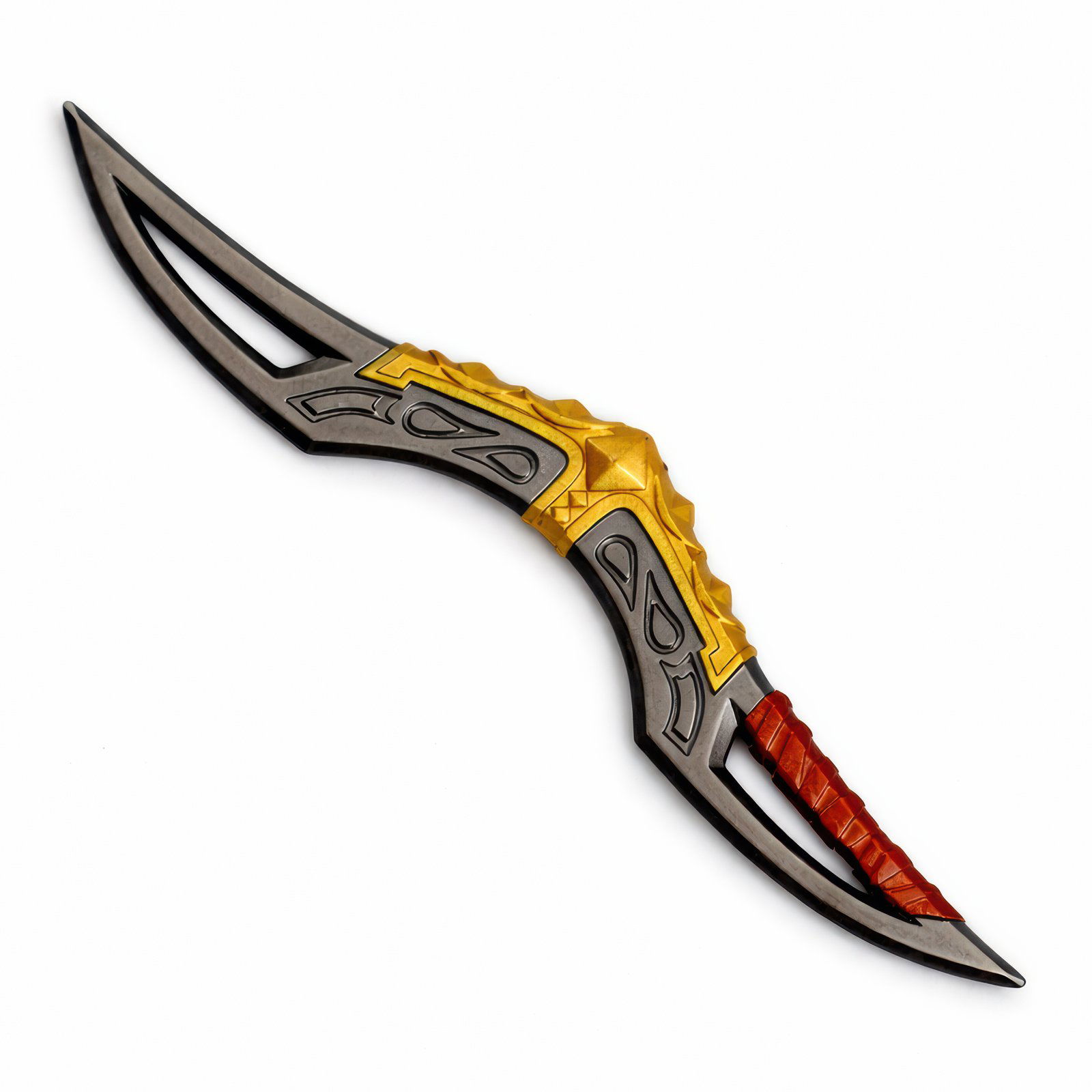 Niewiele broni w Hyrule jest tak kultowych jak bumerang, ulubiony przez bohatera zarówno do walki, jak i rozwiązywania zagadek. Ta 16-centymetrowa replika zaufanej broni Linka wykonana jest z wytrzymałego metalu, ukształtowana dokładnie tak, jak w serii Zelda, i wykończona bogatym, patynowanym złotem. Szczegółowe krzywizny i krawędzie są natychmiast rozpoznawalne, a całość służy jako solidny brelok, gotowy do towarzyszenia Ci w Twoich własnych przygodach. Dodaj odrobinę Hyrule do kluczy, torby lub kolekcji tym niezbędnym elementem dla każdego fana Zeldy.