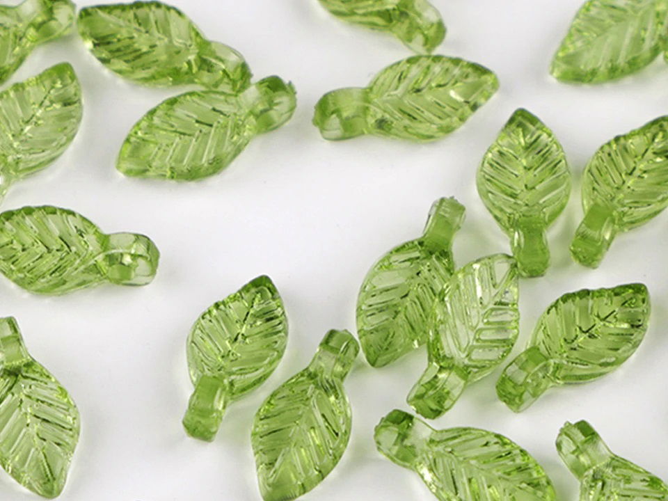 Lekko zakrzywione, plastikowe listki z otworem do przewlekania umieszczonym w ogonku. Wzór unerwienia liścia jest obustronny.W skład mixu wchodzą trzy odcienie zieleni, otwór do przewlekania znajduje się w górnej części liścia. Zalecamy zastosować ogniwko łączące.