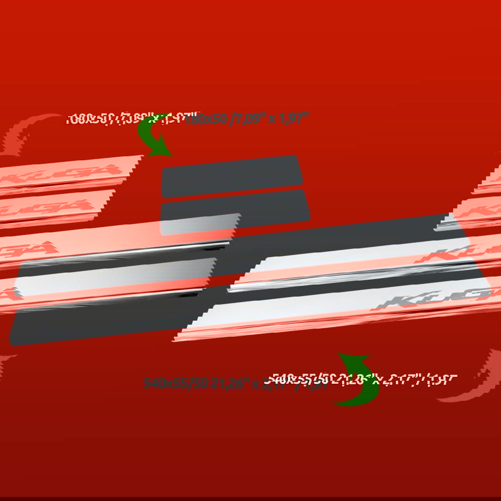 Najwyższa jakość: Nasze nakładki progów drzwi są wykonane z najwyższej jakości stali nierdzewnej 304, zapewniając wyjątkową trwałość i długowieczność. Lustrzane wykończenie nadaje im elegancki i wypolerowany wygląd. Grawerunki są wykonywane w procesie piaskowania.