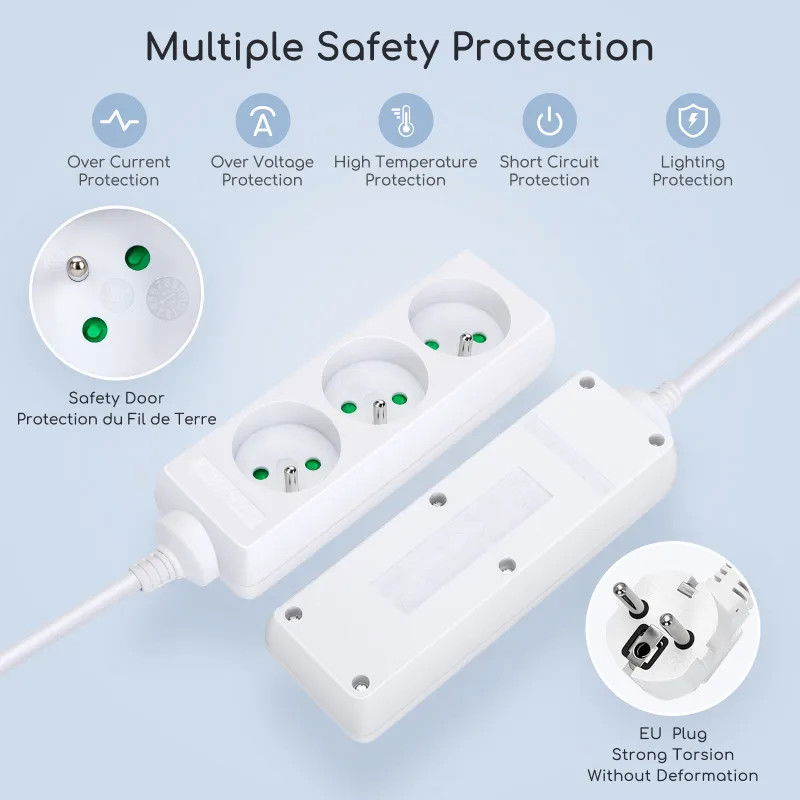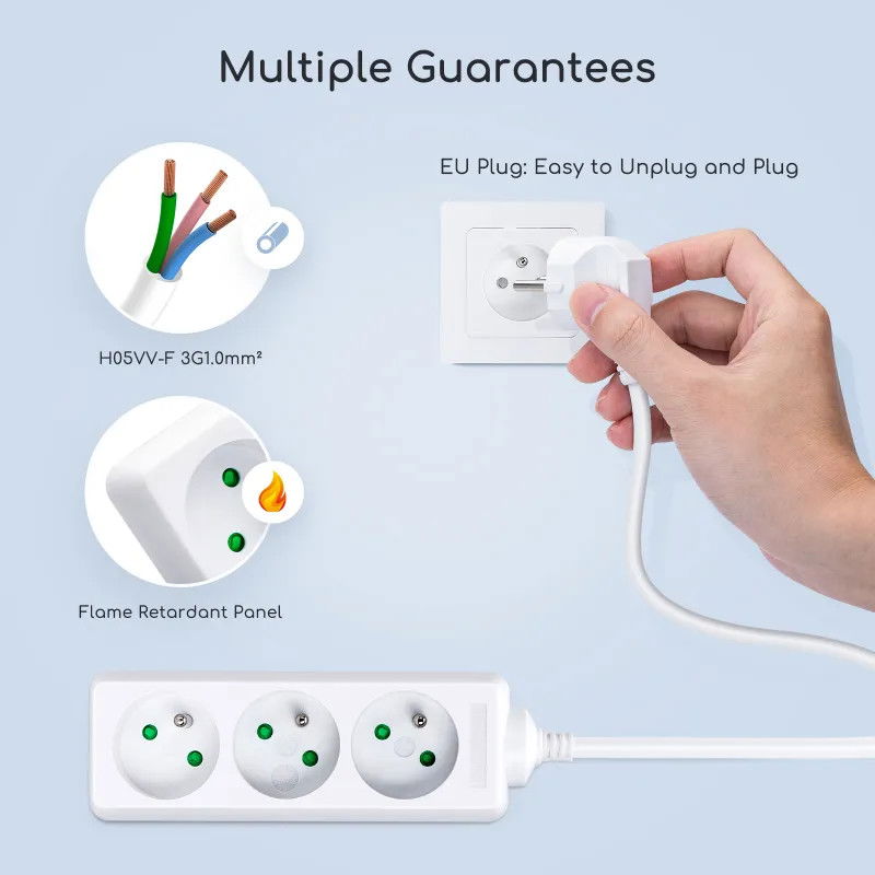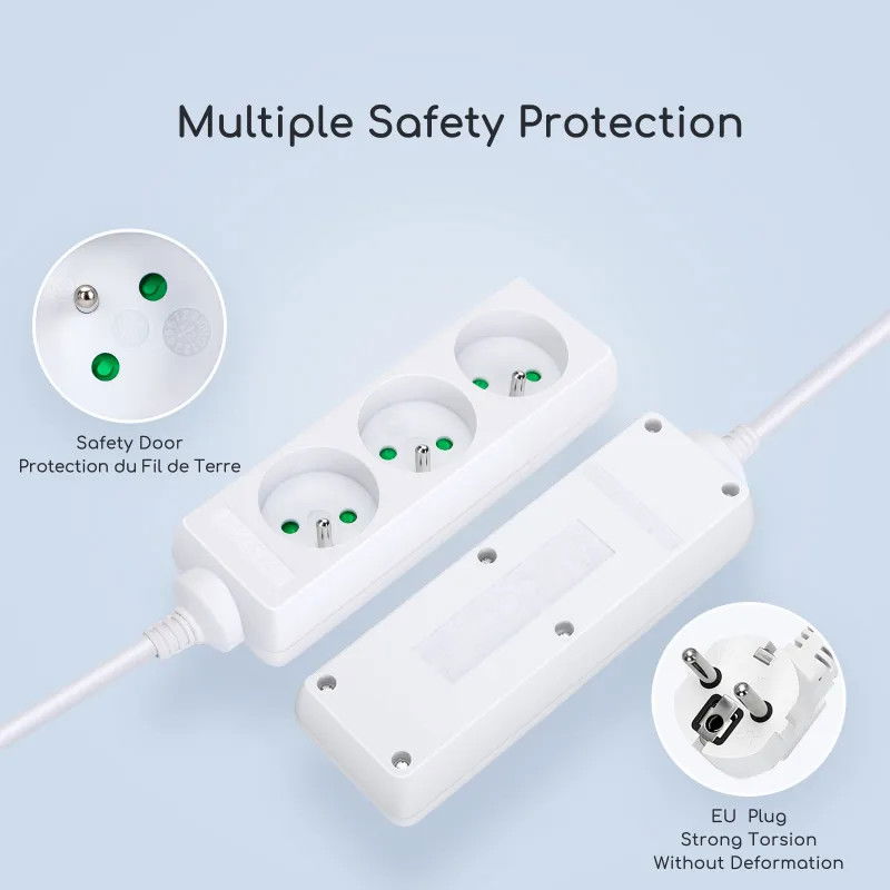 Standardowy przewód elektryczny. Wysokiej jakości blacha miedziana, odporna na podłączanie i odłączanie. Chroń dzieci przed porażeniem prądem elektrycznym. Zintegrowana wtyczka. Ogólnie odporny na działanie wysokich temperatur. Wysokiej jakości trójżyłowa miedź drut o dobrej przewodności i niskim wytwarzaniu ciepła, wytrzymuje długotrwałe użytkowanie przy pełnym obciążeniu, jest bezpieczny i stabilny. „Wysokiej jakości blacha miedziana o dobrej elastyczności i odporności na rdzę, nie poluzuje się po 5000-krotnym normalnym użytkowaniu. Każde gniazdo posiada niezależne wewnętrzne drzwiczki zabezpieczające, które skutecznie zapobiegają włożeniu palców dzieci lub metalowych przedmiotów trzymanych w dłoni, zmniejszają ryzyko porażenia prądem elektrycznym i w pełni chronią bezpieczeństwo dzieci. . Wysokiej jakości wtyczka, wzmocniona skręcanie nie powoduje deformacji, uczucie miękkości w dłoni, długa żywotność z wtyczką, zgodnie z europejskimi standardami certyfikacyjnymi. Certyfikat CE, całe ciało wykorzystuje ognioodporny materiał PP, wysoką temperaturę i odporność ogniową.