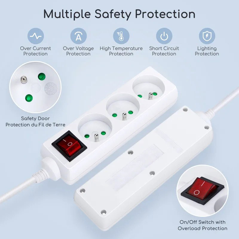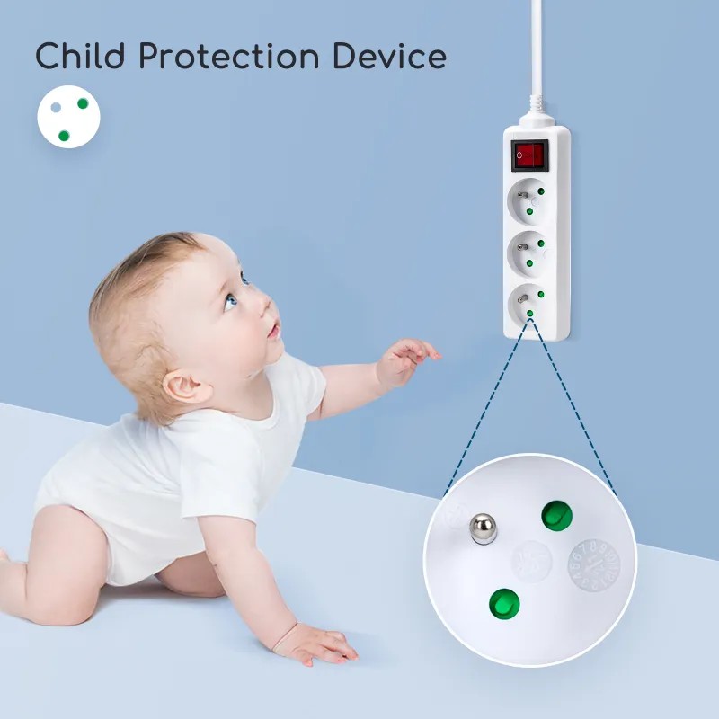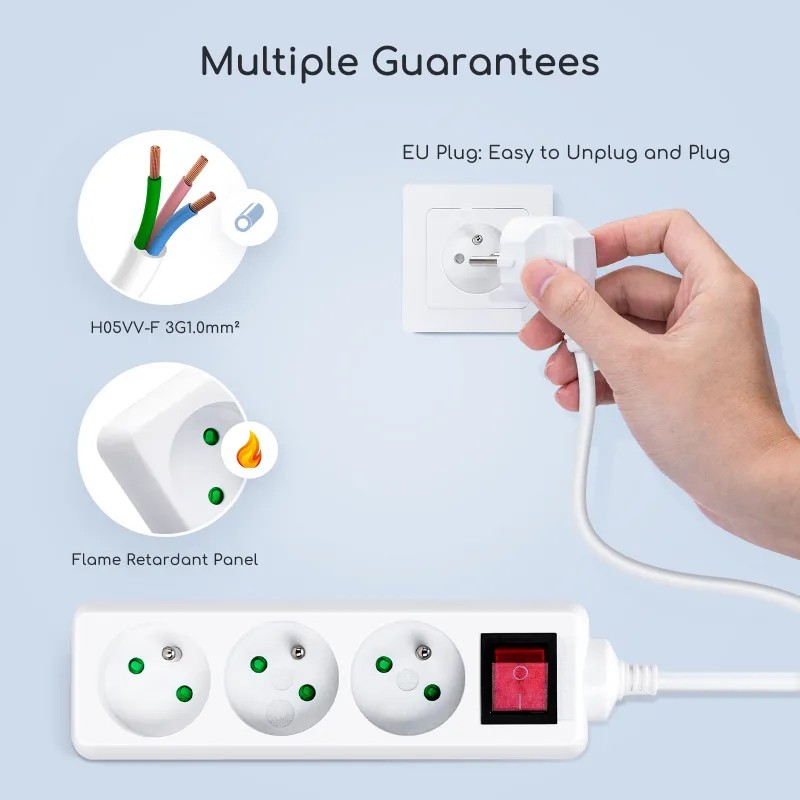 Przewód zasilający o standardzie europejskim. Chroń dzieci przed porażeniem prądem elektrycznym. Odporny na podłączanie i odłączanie. Zintegrowana wtyczka. Wysokiej jakości trójżyłowy kabel miedziany, minimum 32 na akcję, dobra liniowość, mały ciepła, aby sprostać długotrwałemu użytkowaniu przy pełnym obciążeniu. Każde gniazdo posiada niezależne wewnętrzne drzwiczki zabezpieczające, które mogą skutecznie zapobiegać wkładaniu palców dzieci lub metalowych przedmiotów trzymanych w rękach, zmniejszać ryzyko porażenia prądem elektrycznym i w pełni chroń bezpieczeństwo dzieci. Miedziana elastyczna mocna, normalna wtyczka 5000 razy nie poluzowana. Wzmożone skręcanie nie powoduje odkształceń, zgodnie z europejskimi normami certyfikacyjnymi. 1-Nadaje się wyłącznie do użytku w pomieszczeniach. 2-Nie zakrywaj go, gdy jest używany. 3-Włóż odpowiednie wtyczki. 4-Jeśli nie jest używany, wyłącz zasilanie. 5-Trzymać z dala od dzieci.