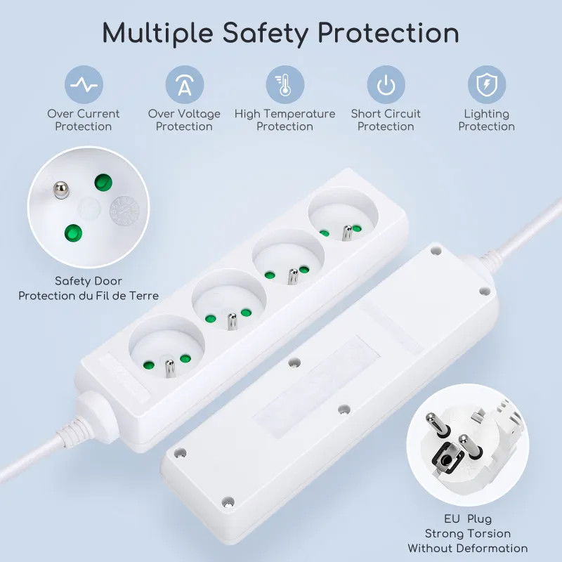 Standardowy przewód elektryczny. Wysokiej jakości blacha miedziana, odporna na podłączanie i odłączanie. Chroń dzieci przed porażeniem prądem elektrycznym. Zintegrowana wtyczka. Ogólnie odporny na działanie wysokich temperatur. Wysokiej jakości trójżyłowa miedź drut o dobrej przewodności i niskim wytwarzaniu ciepła, wytrzymuje długotrwałe użytkowanie przy pełnym obciążeniu, jest bezpieczny i stabilny. „Wysokiej jakości blacha miedziana o dobrej elastyczności i odporności na rdzę, nie poluzuje się po 5000-krotnym normalnym użytkowaniu. Każde gniazdo posiada niezależne wewnętrzne drzwiczki zabezpieczające, które skutecznie zapobiegają włożeniu palców dzieci lub metalowych przedmiotów trzymanych w dłoni, zmniejszają ryzyko porażenia prądem elektrycznym i w pełni chronią bezpieczeństwo dzieci. . Wysokiej jakości wtyczka, wzmocniona skręcanie nie powoduje deformacji, uczucie miękkości w dłoni, długa żywotność z wtyczką, zgodnie z europejskimi standardami certyfikacyjnymi. Certyfikat CE, całe ciało wykorzystuje ognioodporny materiał PP, wysoką temperaturę i odporność ogniową.