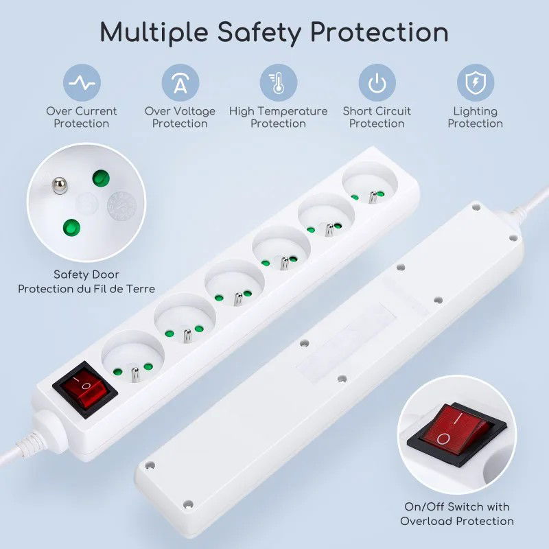 Przewód zasilający o standardzie europejskim. Chroń dzieci przed porażeniem prądem elektrycznym. Odporny na podłączanie i odłączanie. Zintegrowana wtyczka. Wysokiej jakości trójżyłowy kabel miedziany, minimum 32 na akcję, dobra liniowość, mały ciepła, aby sprostać długotrwałemu użytkowaniu przy pełnym obciążeniu. Każde gniazdo posiada niezależne wewnętrzne drzwiczki zabezpieczające, które mogą skutecznie zapobiegać wkładaniu palców dzieci lub metalowych przedmiotów trzymanych w rękach, zmniejszać ryzyko porażenia prądem elektrycznym i w pełni chroń bezpieczeństwo dzieci. Miedziana elastyczna mocna, normalna wtyczka 5000 razy nie poluzowana. Wzmożone skręcanie nie powoduje odkształceń, zgodnie z europejskimi normami certyfikacyjnymi. 1-Nadaje się wyłącznie do użytku w pomieszczeniach. 2-Nie zakrywaj go, gdy jest używany. 3-Włóż odpowiednie wtyczki. 4-Jeśli nie jest używany, wyłącz zasilanie. 5-Trzymać z dala od dzieci.