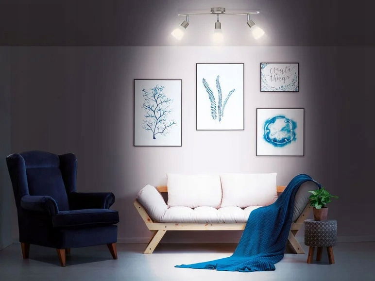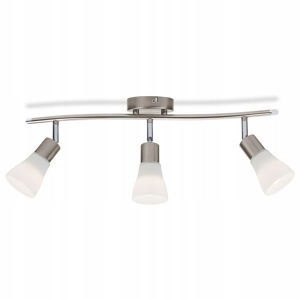 podłużna:obracane i przechylane reflektorki z matowymi, białymi kloszami szklanymistabilny metalowy korpus o wyglądzie matowego niklu3 energooszczędne żarówki LED o ciepłym, białym świetledo montażu na suficie w pomieszczeniach