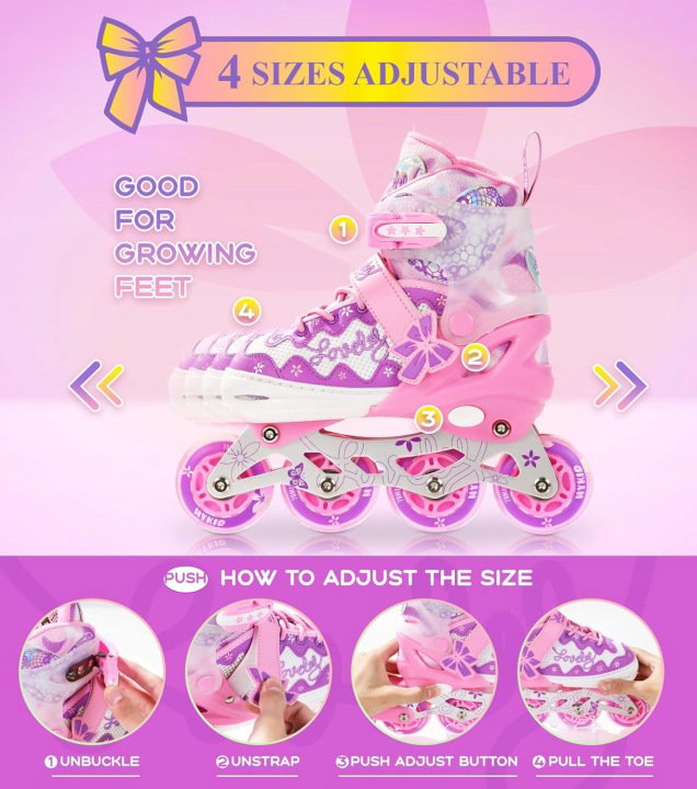 ⭐4 regulowane rozmiary – Nasze rolki mają 4 regulowane rozmiary, dzięki czemu możesz wybrać rozmiar, który Ci odpowiada, a także towarzyszyć dziecku w powolnym wzroście