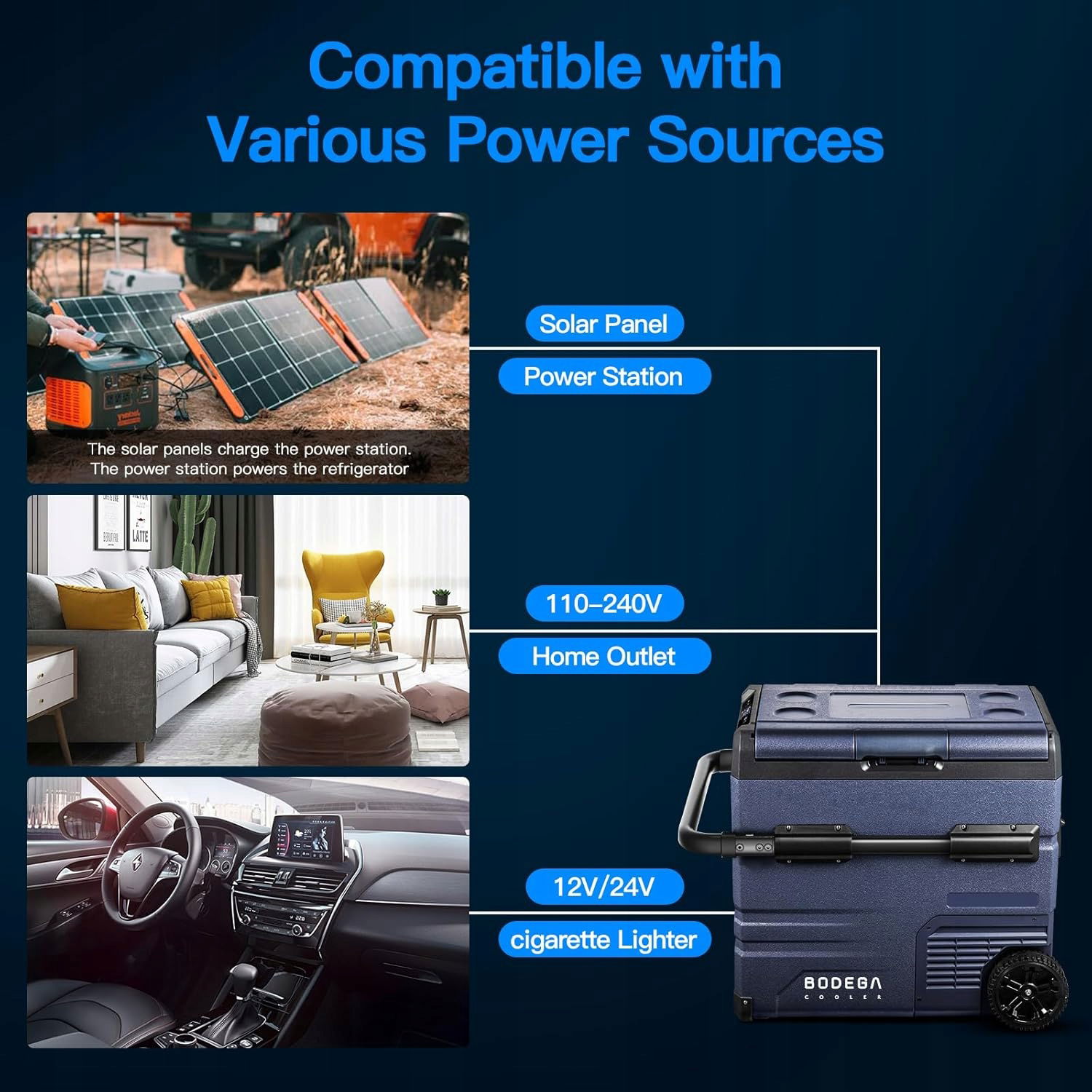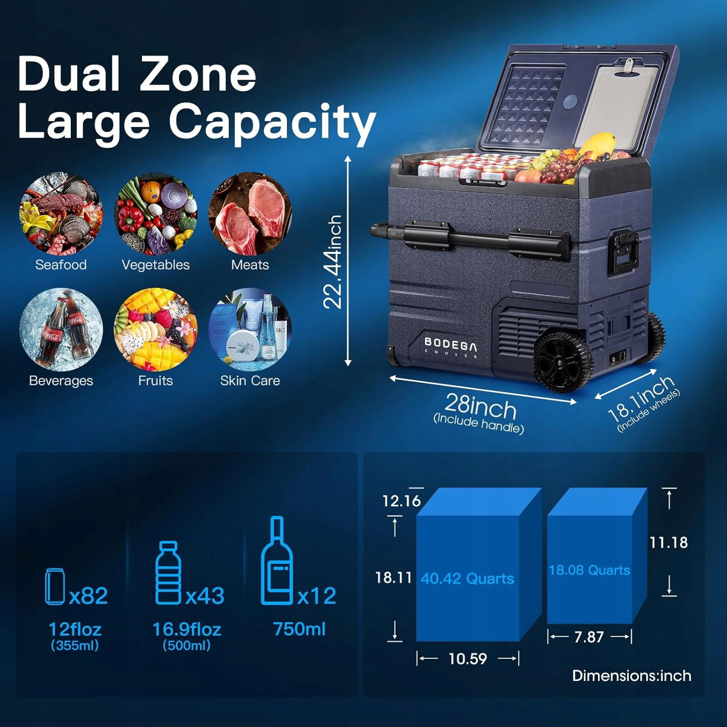 ✅ Funkcje: Sterowanie WIFI+APP, ręczne sterowanie, niezależna kontrola temperatury w podwójnej strefie -20℃~20℃, koła, deska do krojenia, wysuwany uchwyt, otwieracz do butelek, wewnętrzna konstrukcja świetlna LED, ochrona baterii, wsparcie 12/24V DC i 100-240V AC, port lodówki z regulowaną orientacją, port ładowania USB