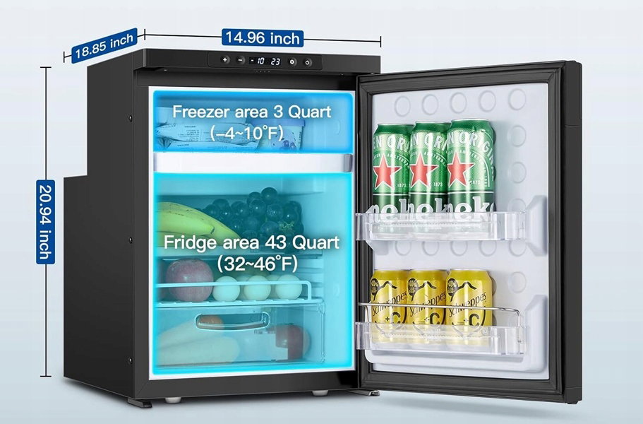 lodówka 12 V jest wyposażona w oświetlenie LED, dzięki czemu można dobrze widzieć, gdzie znajduje się Twoja żywność nawet przy słabym oświetleniu;