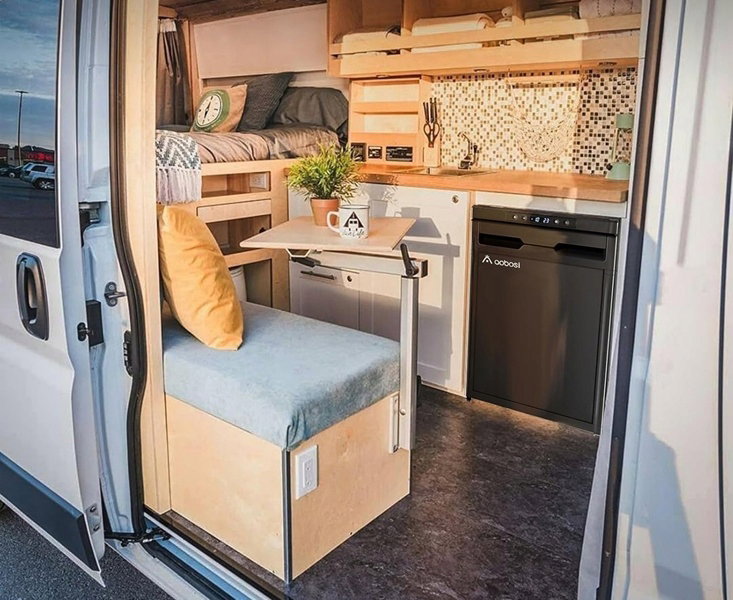 kompresor chłodzący jest estetyczny i zajmuje mało miejsca w konstrukcji montażowej, która optymalnie wykorzystuje istniejące miejsce w przyczepie kempingowej.
