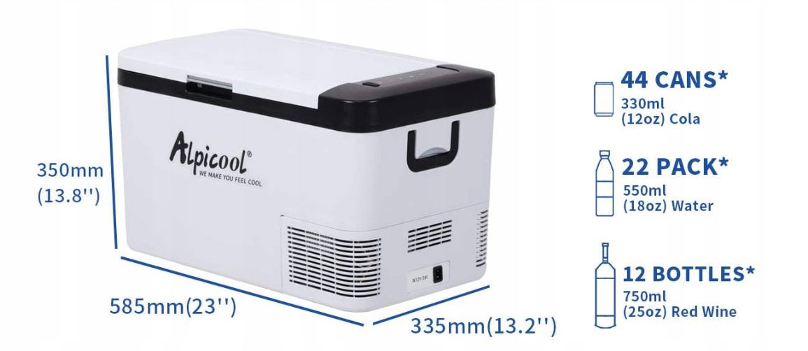 - ✴️KOMPAKTOWA KONSTRUKCJA I DUŻA POJEMNOŚĆ. Lodówka samochodowa Alpicool K25 o wymiarach zewnętrznych 23'' x 13,2'' x 13,8'' umożliwia łatwe przenoszenie jej wszędzie dzięki dwóm uchwytom. Ta 25-litrowa lodówka samochodowa jest wystarczająco pojemna, aby pomieścić 44 butelki Coca-Coli o pojemności 330 ml lub 22 butelki o pojemności 550 ml.