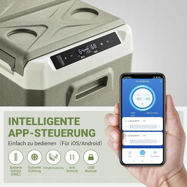 Lodówki samochodowe AAABOSI są wyposażone w wydajną technologię chłodzenia kompresorowego (od 20°C do 20°C) w trybach MAX (szybkie chłodzenie) i ECO (oszczędność energii); w trybie MAX temperaturę lodówki samochodowej można szybko obniżyć do 0°C w niecałe 15 minut; w trybie ECO lodówka zużywa bardzo mało energii, wydłużając zasięg pojazdu i zmniejszając potrzebę częstego ładowania.