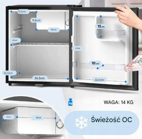 - Znajdź swoje miejsce wszędzie – nie chcesz rezygnować z schłodzonych napojów, świeżej żywności lub dobrze schłodzonej ulubionej przekąski? Jeśli tak, to ten elegancki minibar będzie idealnym uzupełnieniem. Dzięki kompaktowej konstrukcji i praktycznym wymiarom zewnętrznym mini lodówka wszędzie znajdzie swoje miejsce i zachwyca eleganckim wzornictwem. Idealna do biura, na kemping, do małych gospodarstw domowych lub jako mobilna mini lodówka w podróży. - Dzięki kompaktowej konstrukcji jest bardzo łatwe!