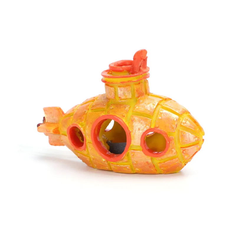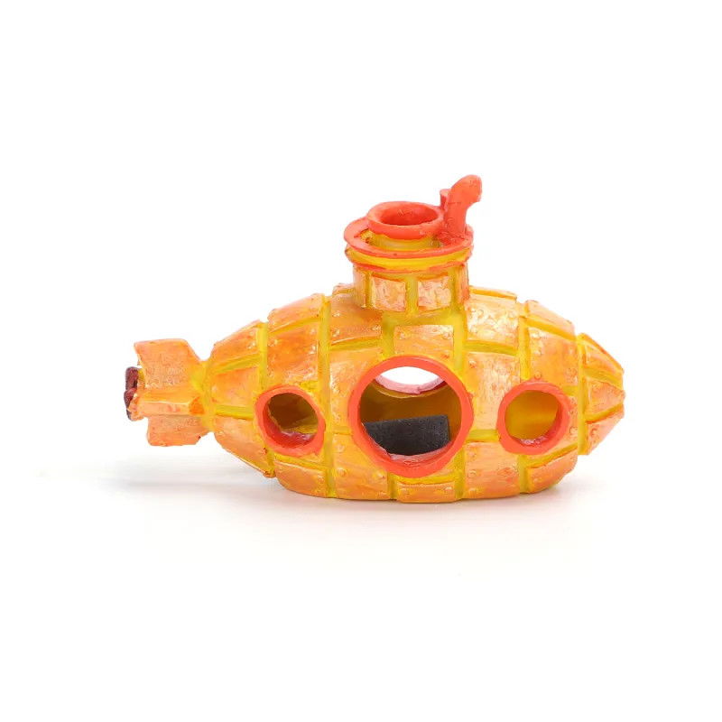 Żółta łódź podwodna ozdobny batyskaf do dekoracji akwarium. Z kamykiem do dostarczania powietrza dla rybek akwariowych. Ozdoba do postawienia na dnie zbiornika z rybkami.
