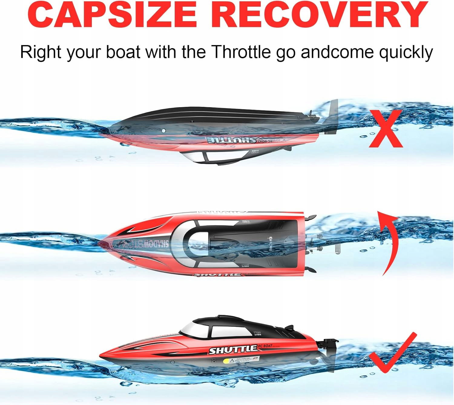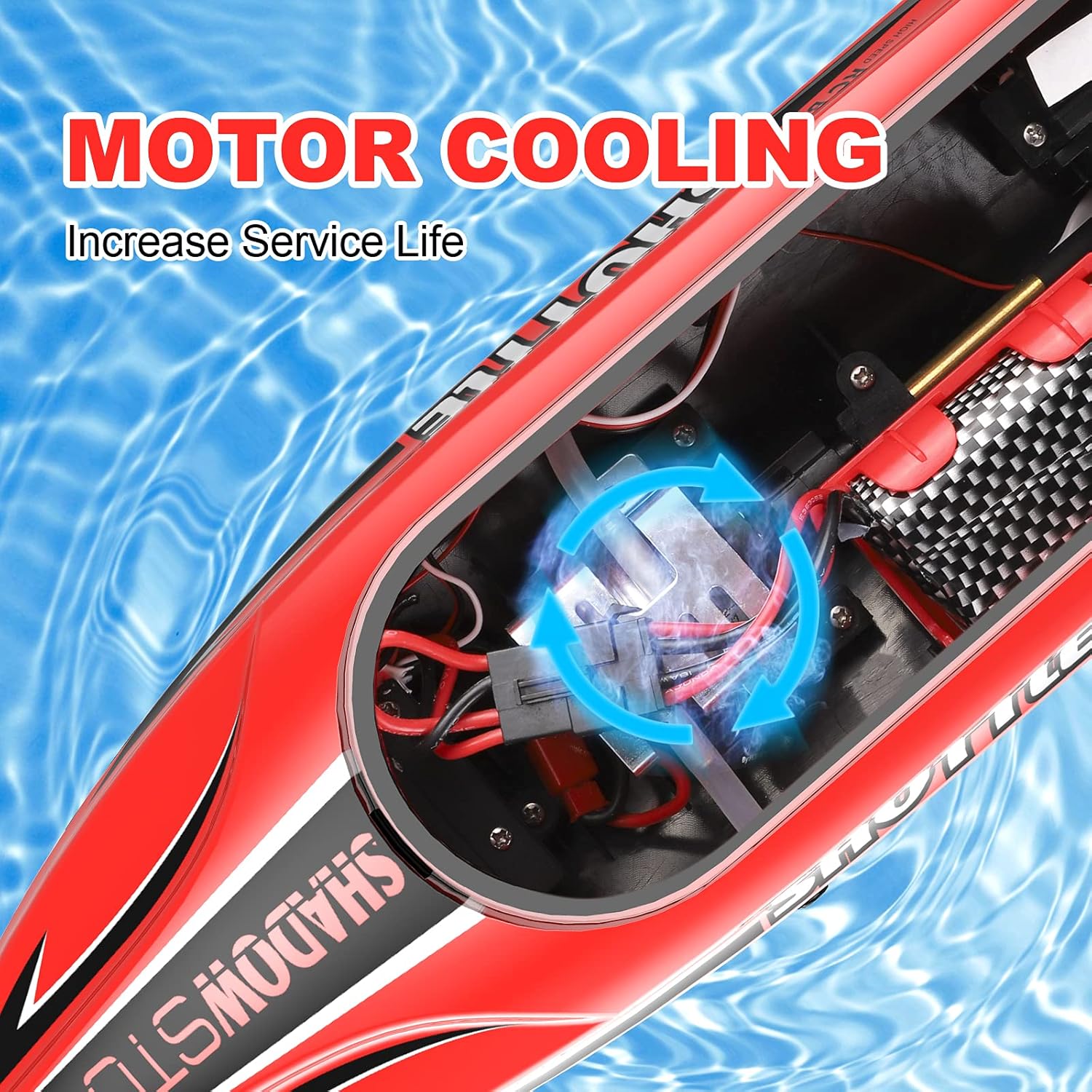 Wysoka częstotliwość 2,4 GHz – zasięg sterowania łodzią elektryczną zdalnie sterowaną wynosi około 100-150 m. Wyposażona w silikonową osłonę antykolizyjną, która skutecznie łagodzi skutki zderzeń i uszkodzeń kadłuba łodzi, wydłużając jego żywotność.