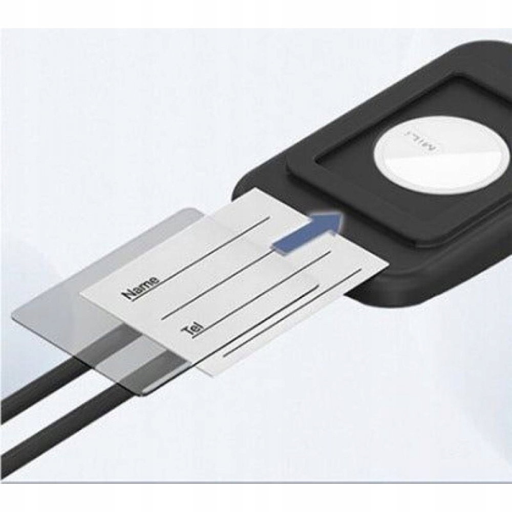 W zestawie z MiTagiem znajduje się silikonowy identyfikator na bagaż. Z tyłu znajduje się miejsce na Twoje dane zabezpieczone folią PET a wewnątrz MiTag.