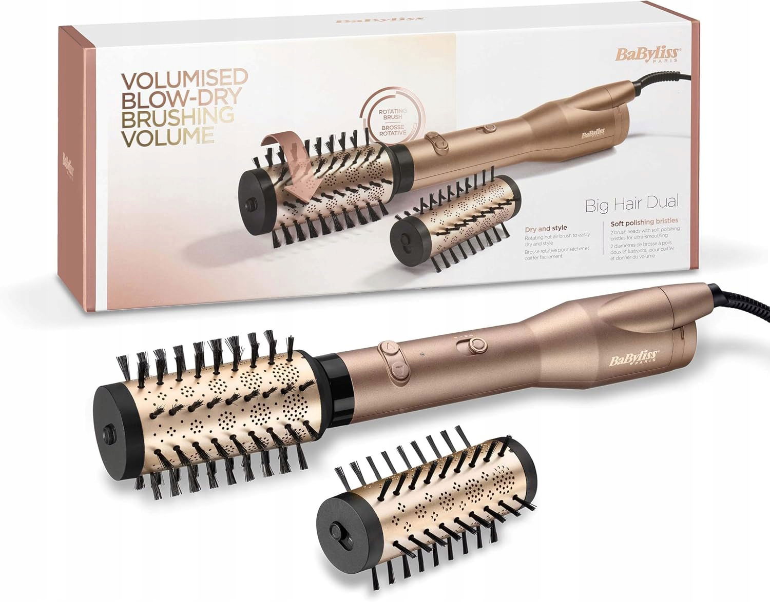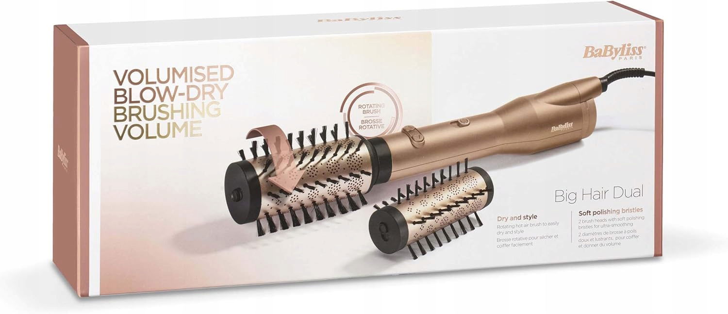 BaByliss Big Hair Dual to obrotowa szczotka na ciepłe powietrze, która suszy, wygładza i unosi włosy od nasady, nadając fryzurze profesjonalny wygląd każdego dnia