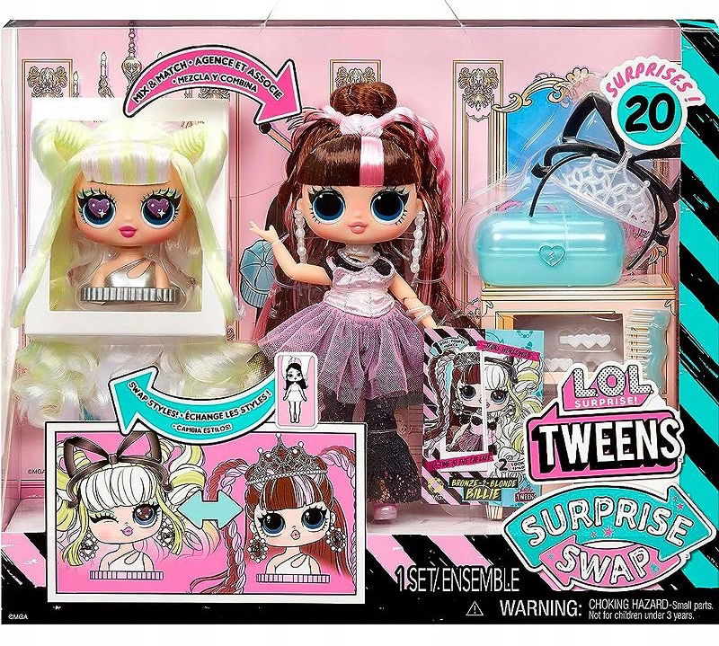- zbierz wszystkie 4 modne lalki L.O.L. Surprise Tweens Surprise Swap: Braids-2-Waves Winnie, Bronze-2-Blonde Billie, Buns-2-Braids Bailey i Curls-2-Crimps Cora.