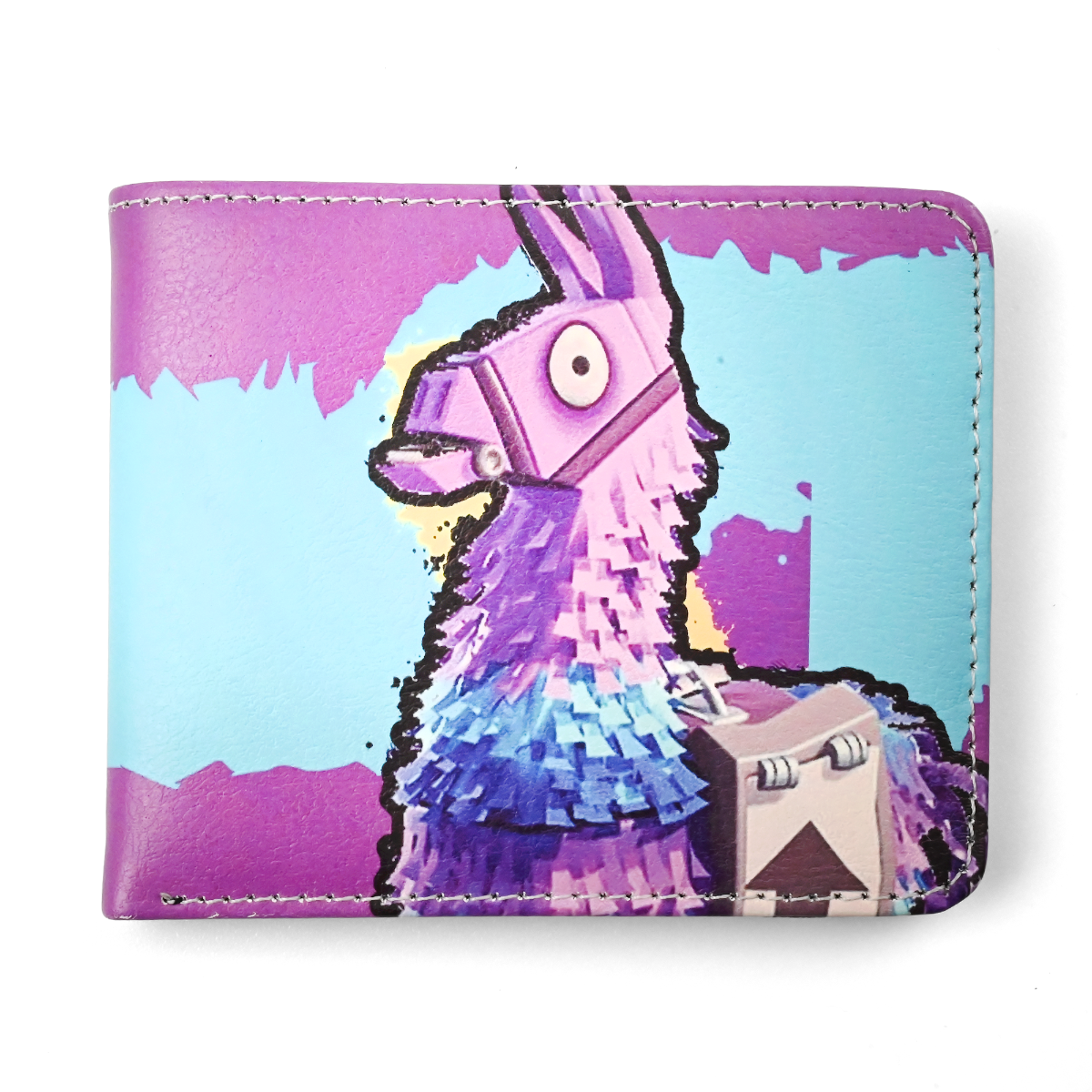 Z zewnątrz pokryty jest gładką ekoskórą z mocnym, pastelowym nadrukiem: intensywny, jasnoniebieski pas pośrodku, a na górze i dole soczysty fiolet, całość obramowana równym białym przeszyciem. Z jednej strony stoi kultowa lama w profilu – zbudowana z warstw lila, fioletu i elektrycznego błękitu, z grubym czarnym konturem i przypiętą skrzynką z łupem, dokładnie jak w grze. Po drugiej stronie widzisz klasyczne logo „Fortnite Battle Royale” na ciemnej tablicy, zawieszone na turkusowo–fioletowym tle, dzięki czemu cały 13-centymetrowy, składany portfel wygląda jak kadr z ekranu lobby. W środku wszystko przechodzi w elegancką czerń: przezroczyste okienko na dokument, kilka miejsc na karty i pionowa kieszeń na suwak na monety lub drobiazgi, a przy dolnej krawędzi nadrukowane białe logo Fortnite. Lekka, a jednocześnie wytrzymała ekoskóra sprawia, że portfel dobrze nosi się na co dzień – do szkoły, pracy czy na nocne sesje z ekipą. To kolorowy, nostalgiczny gadżet dla fana, idealny do używania na co dzień albo na prezent dla kompana z drużyny.