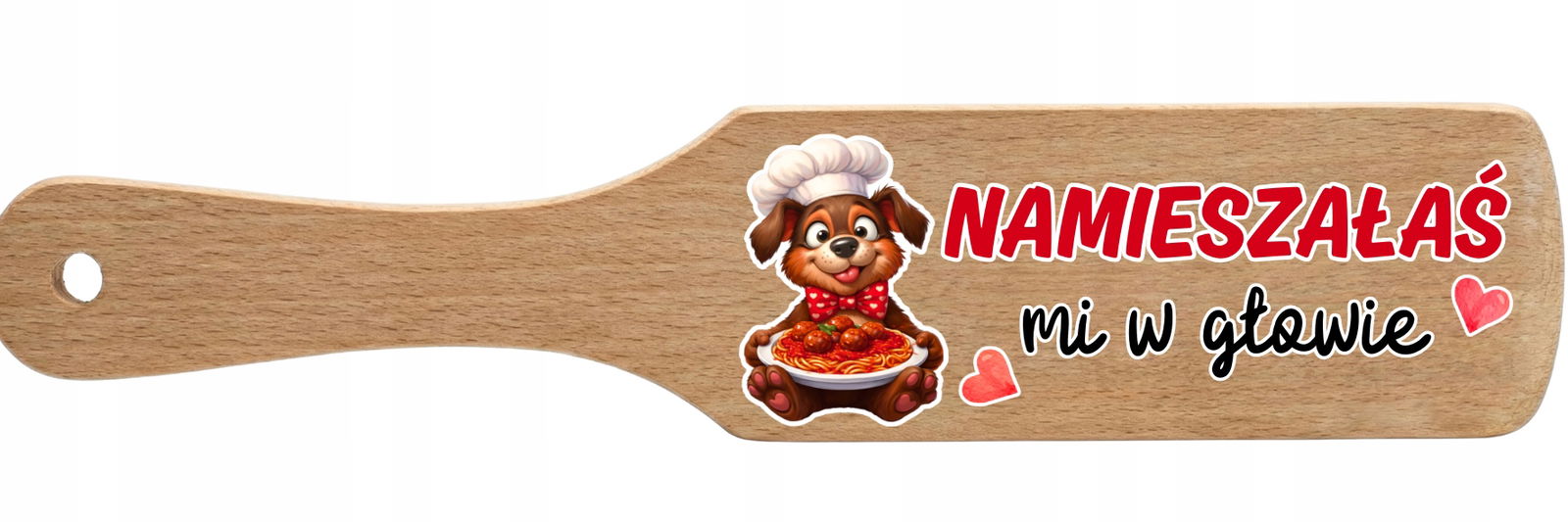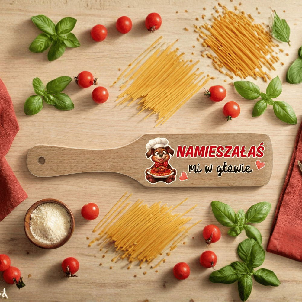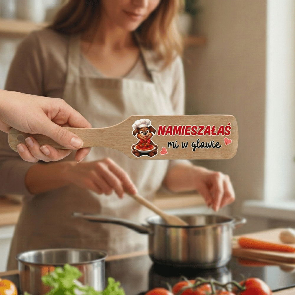 Oferujemy drewnianą łopatkę kuchenną z uroczym, trwałym nadrukiem. To idealny upominek dla dziewczyny, narzeczonej lub żony – szczególnie jeśli droga do Twojego serca prowadzi przez żołądek!