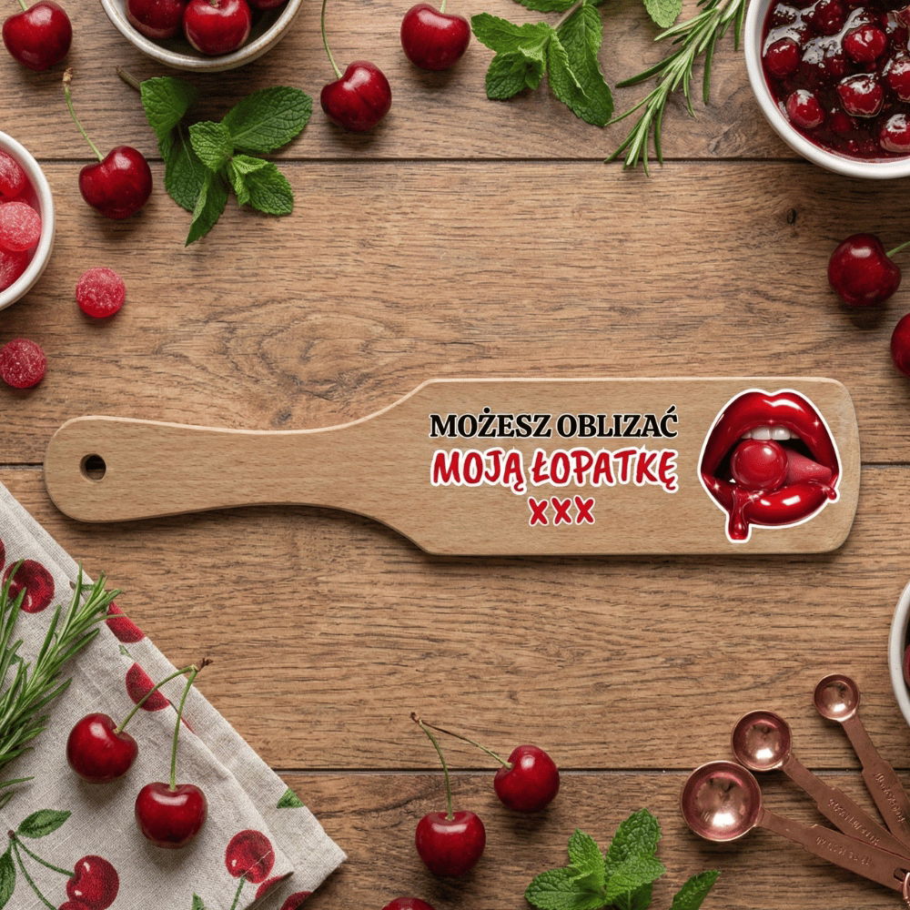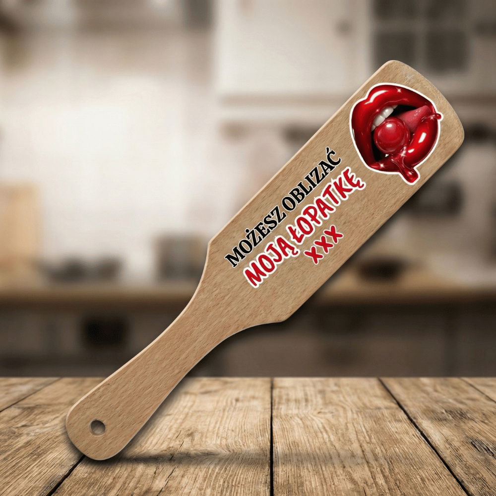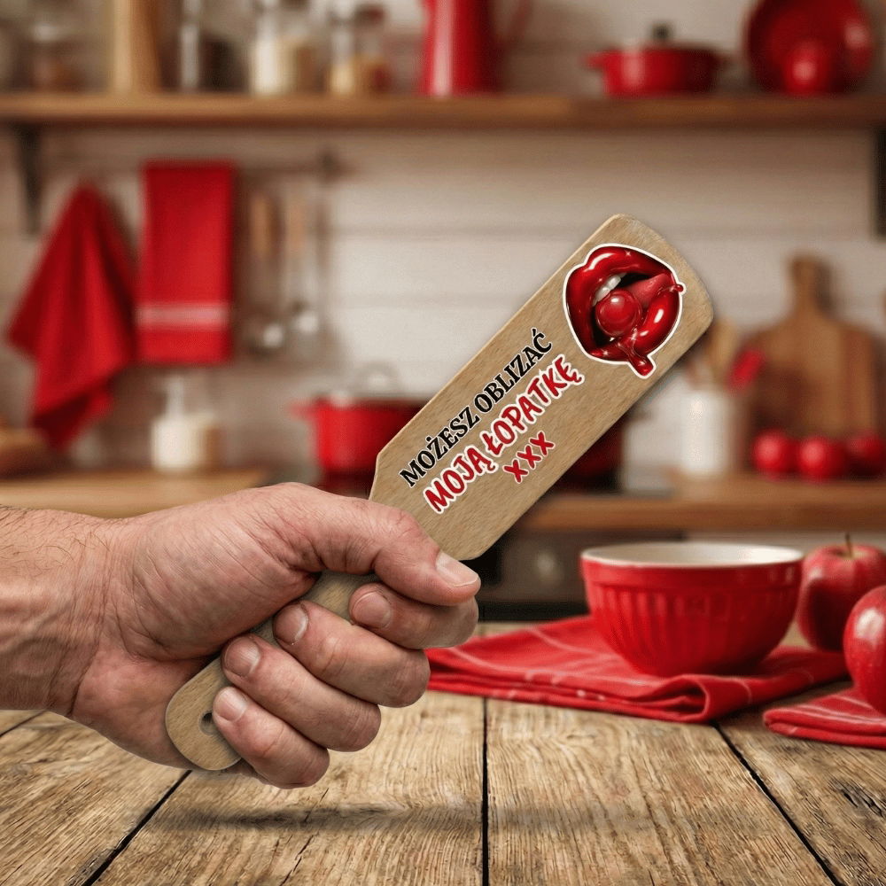 Oferujemy drewnianą łopatkę kuchenną z uroczym, trwałym nadrukiem. To idealny upominek dla dziewczyny, narzeczonej lub żony – szczególnie jeśli droga do Twojego serca prowadzi przez żołądek!