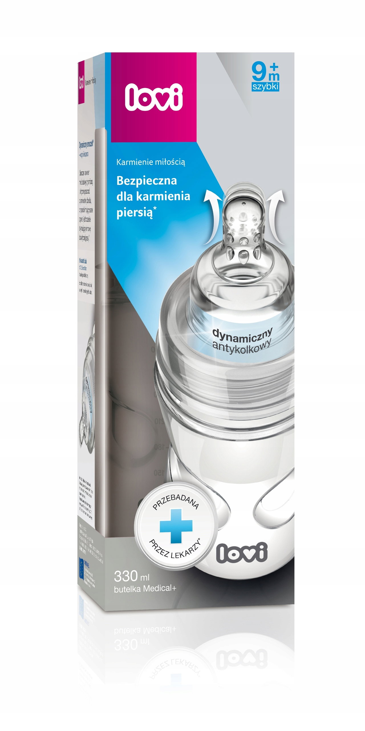 Butelka Medical + firmy LOVI to produkt stworzony z myślą o wygodzie niemowląt. Butelka nie zaburza rytmu ssania, jest więc bezpieczna dla dziecka karmionego piersią. Wykonana jest z polipropylenu bez bisfenolu A. Dynamiczna końcówka smoczka wykonana jest z cienkiej warstwy silikonu, która wydłuża się i kurczy w rytm ssania dziecka. Dziecko musi się natrudzić żeby pobrać pokarm ze smoczka. Twarda, szeroka profilowana podstawka smoczka wymusza prawidłowe ułożenie warg.