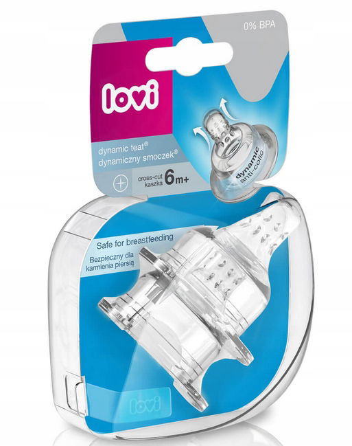 Dynamiczny smoczek LOVI do podawania odciągniętego mleka mamy, to efekt pracy neurologopedów. Jest zbudowany z niejednorodnych warstw silikonu: miękkiej, cienkiej, wydłużającej się końcówki i szerokiej, twardej, profilowanej podstawy. Dzięki temu nie zaburza odruchu ssania i nie koliduje z karmieniem piersią.