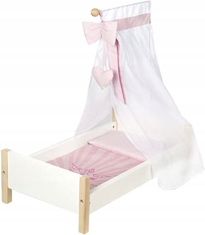 Łóżko dla lalek jest lakierowane na biało i zawiera akcesoria tekstylne. Odpowiednie dla dzieci łóżko dla lalek jest wyposażone w pościel (1 x poduszka, 1 x koc) i piękne baldachim z zawieszką w kształcie serca.