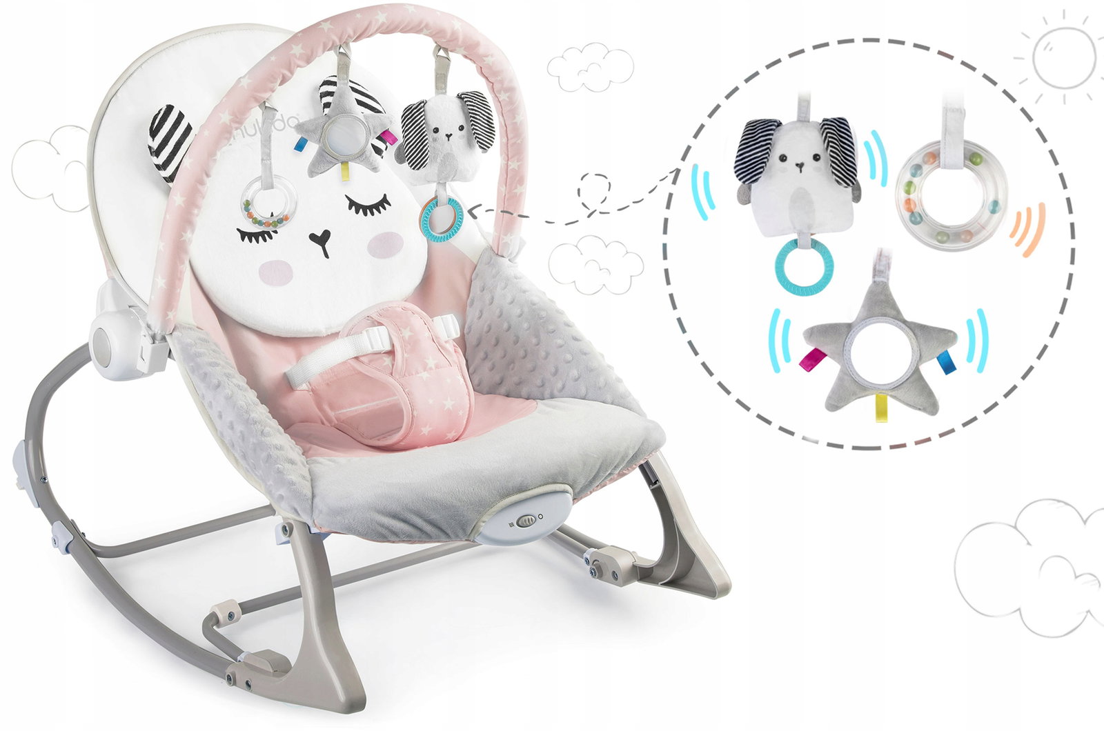 - Funkcje:Pałąk z zabawkami, które można łatwo odczepićSystem wibracji (baterie LR20 1.5V, brak w zestawie)Regulacja nachylenia oparcia w 2 stopniach3-punktowe pasy bezpieczeństwa zapewniające stabilizacjęNóżki antypoślizgowe zapewniające dobrą przyczepność do podłożaBlokada bujania dla dodatkowego bezpieczeństwa