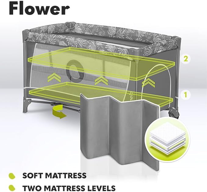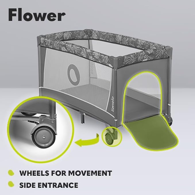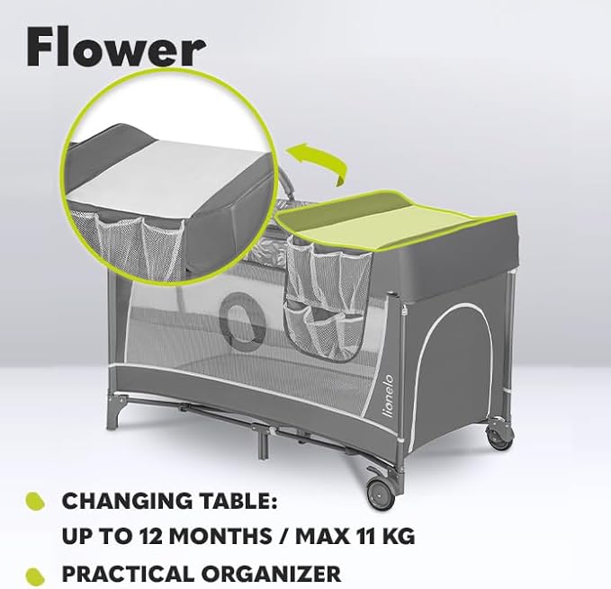 Lionelo Flower to składane łóżeczko turystyczne, które z powodzeniem może pełnić funkcję kojca. Sprawdzi się idealnie w warunkach domowych, jak i podczas wyjazdów lub relaksu na świeżym powietrzu. Interaktywne zabawki, przyjemne dla oka wzornictwo, wydajne zabezpieczenia, a także przydatne akcesoria sprawią, że Flower przypadnie do gustu zarówno opiekunom, jak i dzieciom.